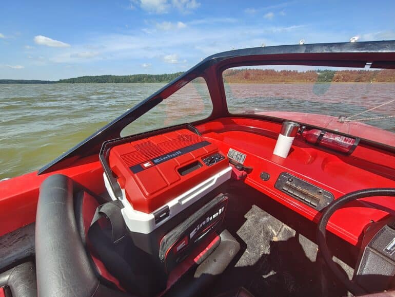Flexibilität ist das A und O beim Vanlife. Die Einhell-Kühlbox bewährte sich sofort in der Praxis. Ohne Kabel und Steckdose versorgte sie uns mit kühlen Getränken auf dem See. Auf dem Motorboot ließ sie sich sicher verstauen und dank Akku-Betrieb völlig autark nutzen. Kein lästiges Kabelgewirr – einfach den 18-Volt-Akku einlegen und los geht’s. Nach dem Vorkühlen an der Haushaltssteckdose (230 V) in unserem Offroad-Anhänger konnten wir die Box ins Boot heben und unterwegs nahtlos weiterbetreiben. Die automatische Umschaltung von Netz- auf Batteriebetrieb funktionierte reibungslos, sodass keine Kühlpause entstand. Beim Baden oder während einer Bootstour genießt man so kalte Getränke, ohne zum Van zurückkehren zu müssen. Selbst leichte Wellen und Sommerhitze brachten die Box nicht aus der Ruhe – der Inhalt blieb gut gekühlt.