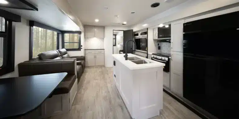 Im Vanlife-Kontext überzeugt der 31BROK durch seine durchdachte Raumaufteilung. Die Außenhöhe beträgt 3,43 Meter, mit Klimaanlage 3,61 Meter, was eine Stehhöhe im Inneren von 2,13 Metern ermöglicht. Das ist praktisch für längere Aufenthalte, ohne ständig gebückt zu gehen. Die Breite erweitert sich mit ausgefahrenen Slides auf 3,96 Meter, was den Innenraum geräumig macht und Platz für bis zu acht Schlafplätze schafft. Solche Kapazitäten sind hilfreich für Gruppenreisen, bei denen der Trailer zum mobilen Zuhause wird.