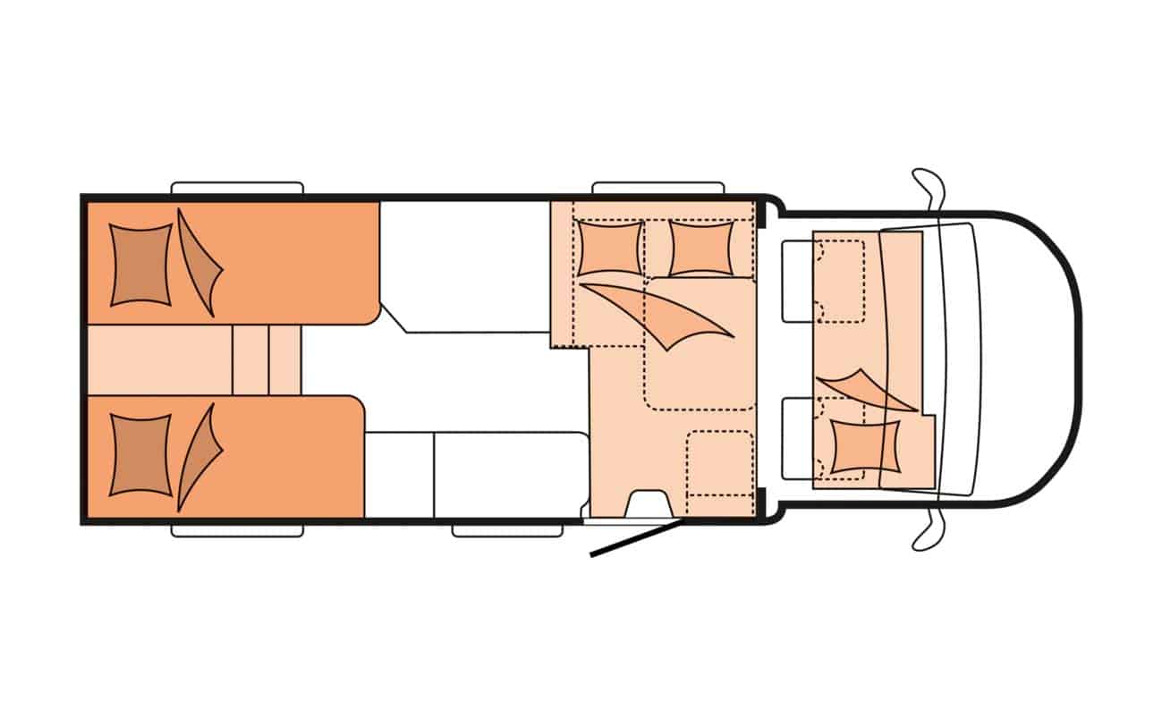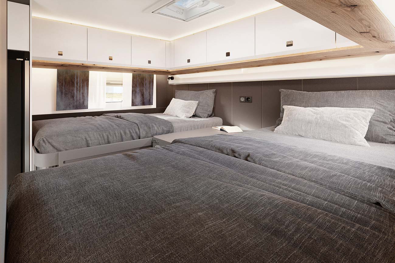 Ebenfalls im Heck sind zwei Einzelbetten in Längsrichtung untergebracht. Das auf der Beifahrerseite ist etwas kürzer und misst 1.900 x 845 Millimeter, das auf der Fahrerseite ist zwölf Zentimeter länger und verfügt über die gleiche Breite. Beide sind mit einem Lattenrostsystem von Goodside ausgestattet, dessen Federleisten aus einem glasfaserverstärkten Kunststoff bestehen. Ein weiteres Doppelbett entsteht, wenn man die Sitzgruppe, die sich im vorderen Bereich befindet, umbaut.