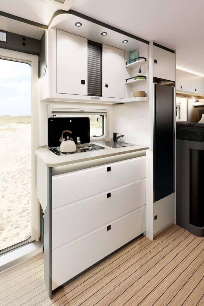 Die Küche befindet sich linker Hand neben der Eingangstür im Aufbau. Sie ist mit Zweiflamm-Gaskocher und Edelstahlspüle ausgestattet – beides mit einer Glasabdeckung. Steht man vor dem Küchenblock, befindet sich links eine Arbeitsflächenerweiterung, die hochgeklappt werden kann, dann aber in die Eingangstür hineinragt. Rechter Hand ist ein hoher Kühlschrank untergebracht, der über ein Volumen von 133 Litern verfügt. Ausreichend also, um Lebensmittel über einen längere Zeitraum zu bunkern. Auch etwas, das man auf einer Yacht auf See tun muss.