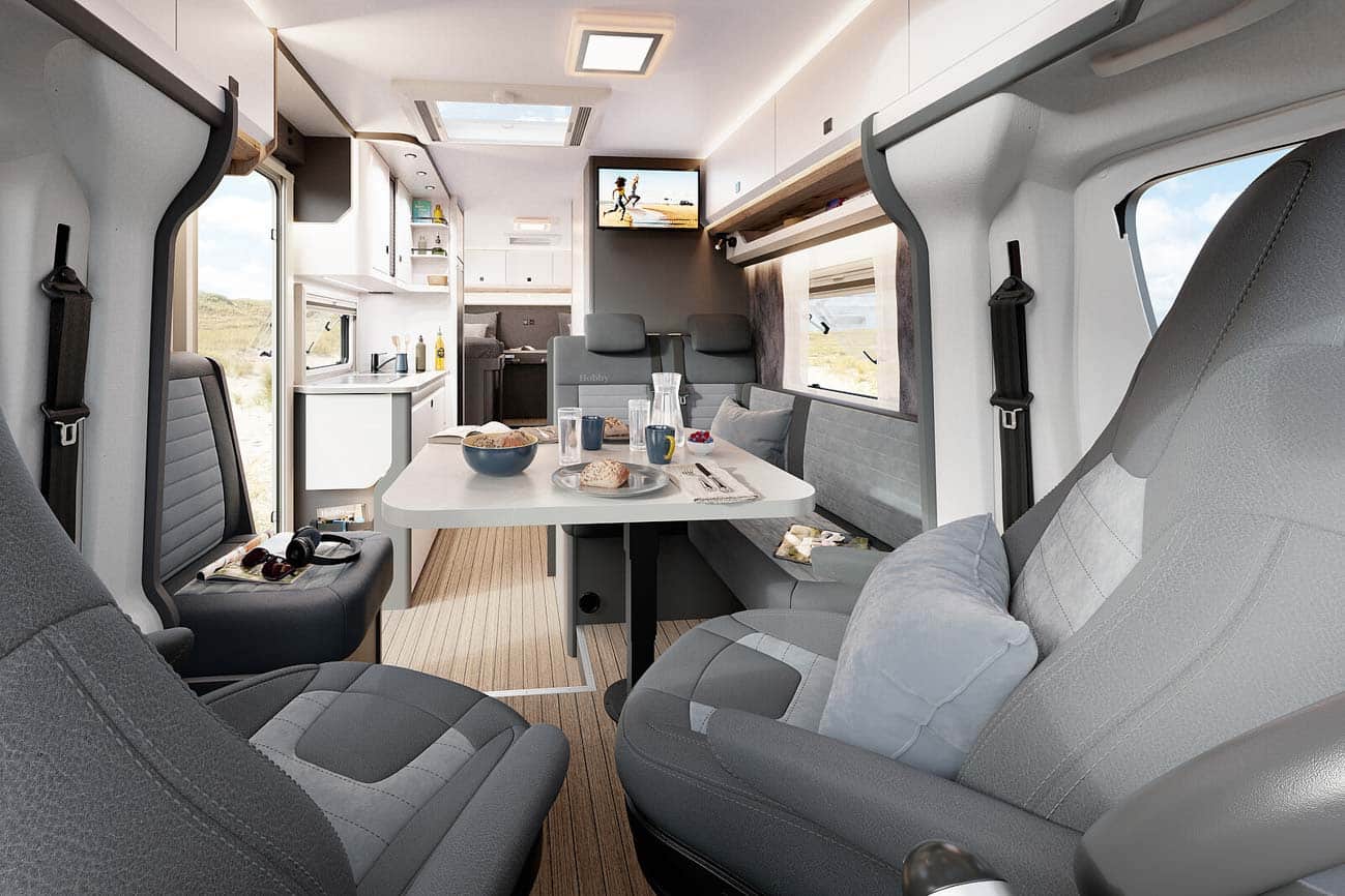 Die Komplett-Vollausstattung des Modells umfasst außerdem eine Markise, Insektenschutzplissees für alle Fenster und die Eingangstür, ein Dachfenster im Fahrerhaus, sowie einen Gasflaschenauszug für zwei Elf-Kilo-Gasflaschen. Ein 100-Liter-Frischwasser- sowie ein 96-Liter-Abwassertank sind ebenfalls an Bord.