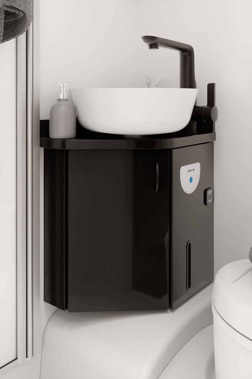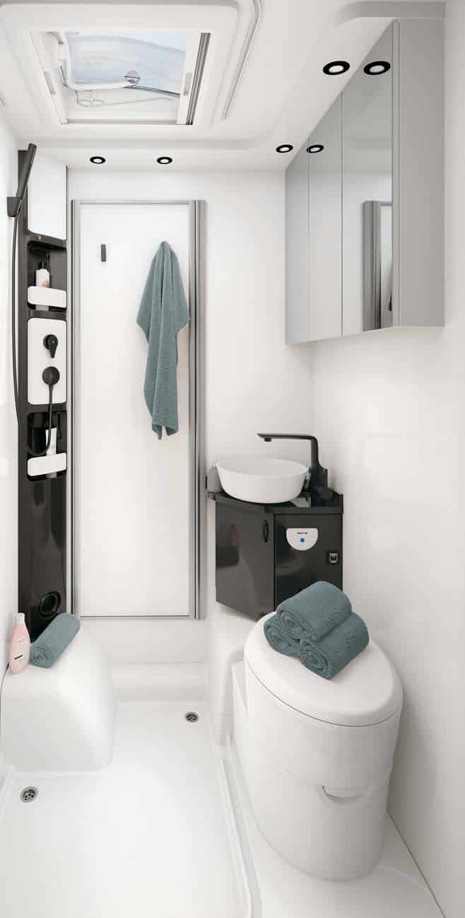 Gegenüber, quasi als Trennung von Schlafbereich und Sitzecke, befindet sich ein kompaktes Bad. Es ist mit Toilette, Waschbecken und Dusche ausgestattet. Eine feste Abtrennung, die um die etwas tiefer liegende Duschtasse herumgezogen werden kann, sorgt dafür, dass Toilette, Waschbecken und Badschränke nicht nass werden.