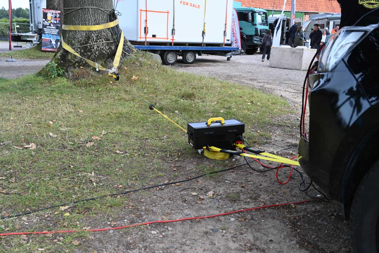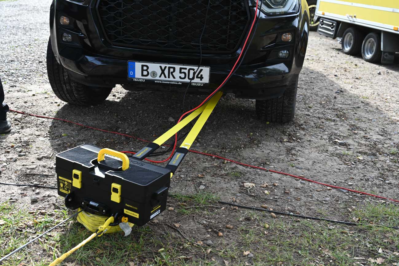 Für den Einsatz wird die Box, in der die Winde fest verschraubt ist, an den Abschlepphaken des Fahrzeugs angeschlagen und an die Batterie angeschlossen. Und das geht sowohl vorne als auch hinten. Alternativ kann man die Winch Box aber zum Beispiel auch an einem Ankerpunkt, wie etwa einem stabilen Baum, anschlagen und das Windenseil zum Fahrzeug führen. Dann sollte jedoch ein zweites Fahrzeug, das für den Strom sorgt, in der Nähe stehen.