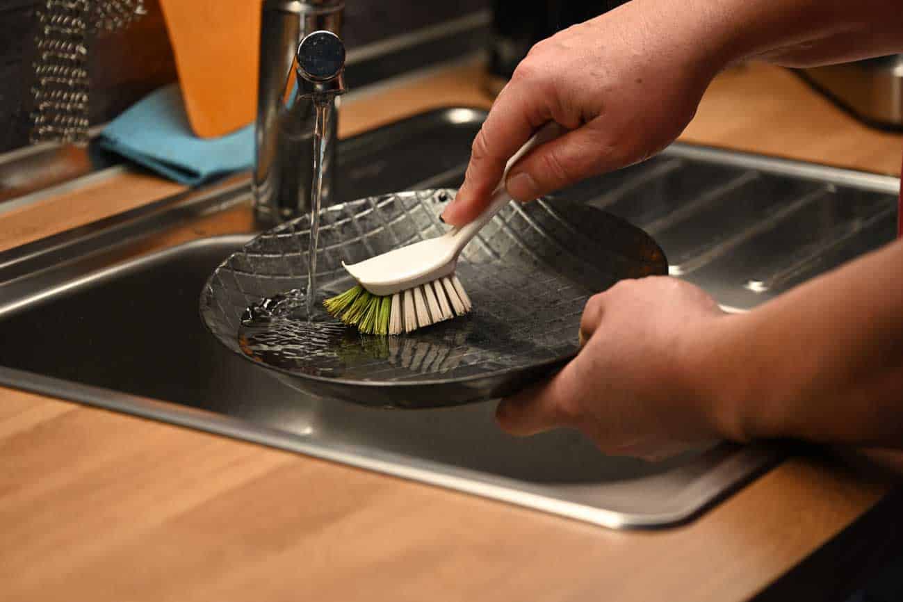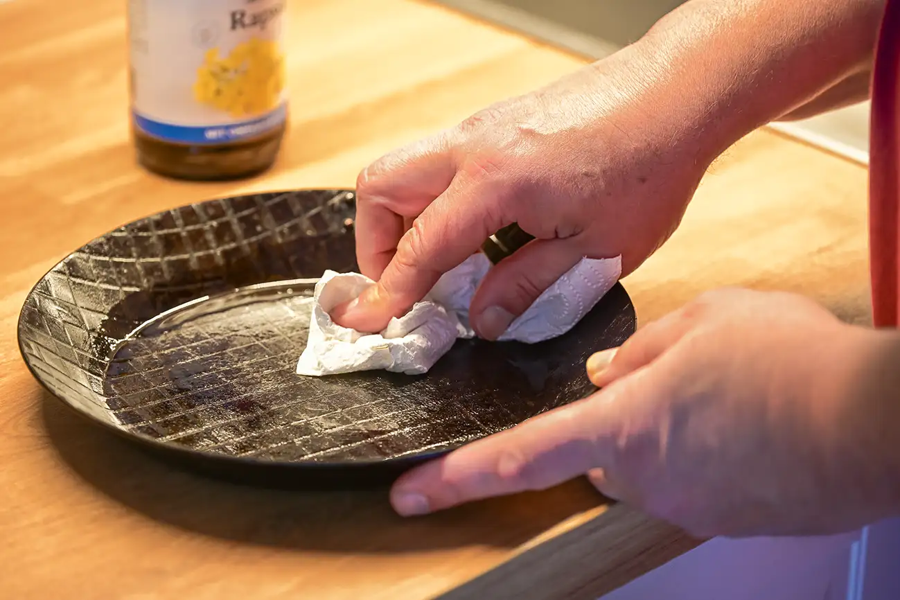 Zunächst spülen wir die Pfanne jedoch – ganz nach Anleitung – mit etwas Spülmittel und Wasser ab, um eventuelle Produktionsrückstände, Öle oder Schmutz zu entfernen. Danach trocknen wir sie gut ab und reiben sie dünn mit Öl ein. Je dünner, umso besser. Dabei sollte man ein Öl verwenden, das man recht hoch erhitzen kann. Da es allerdings ohnehin verbrennt, spielt die Wahl nicht wirklich eine große Rolle. Denn es geht vor allem darum, dass sich auf dem Eisen eine Patina bildet. Sie wird im Laufe der Zeit mit jedem Bratvorgang immer dichter und besser und sorgt so für eine natürliche Antihaftbeschichtung.