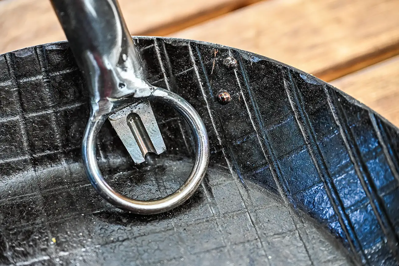 Mit der Elita Eisenpfanne hat Steffen jedoch noch ein weiteres Produkt im Sortiment, das für Camper, Wohnmobilisten, Vanlifer und vor allem für alle Lagerfeuerköche interessant ist. Denn bei der handgeschmiedeten Eisenpfanne kann der Griff einfach abgenommen werden. Und das ist perfekt, denn man kann die Pfanne ins Feuer – oder zu Hause in den Backofen – stellen und der Griff aus Holz bleibt unbeschädigt.