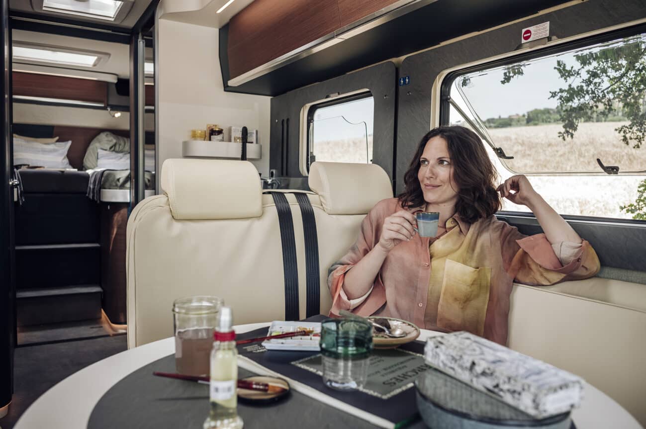 Im Innenraum setzt sich das hochwertige Design fort. Das Armaturenbrett ist mit Kunstleder und kontrastierenden Ziernähten versehen, wie man es aus Sportwagen kennt. Fahrer und Beifahrer nehmen in dicken, drehbaren Kapitänssesseln mit Armlehnen Platz. Dank der ebenen Wohnraumbodenkonstruktion ohne Stolperstufen kann man sich im Kreos H 5109 frei bewegen, als wäre man in einer stylischen Ferienwohnung auf Rädern unterwegs.