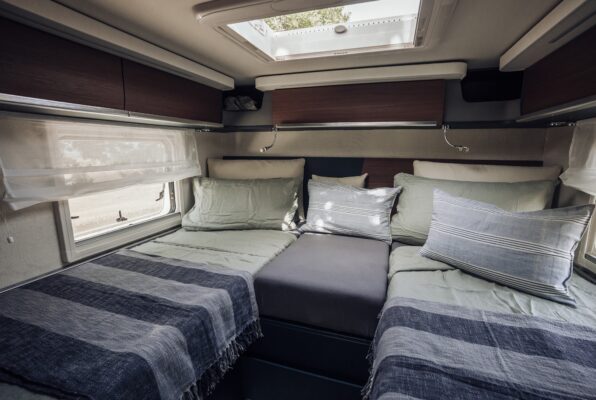 Das eigentliche Schlafzimmer befindet sich im Heck: Zwei großzügige Einzelbetten (je ca. 80 x 195 cm) lassen sich bei Bedarf zu einer großen Liegewiese verbinden. Darunter befindet sich eine geräumige Heckgarage, die sogar Platz für E-Bikes oder anderes sperriges Campinggepäck bietet. Praktisches Detail für Weinliebhaber: In der beheizten Garage ist sogar eine beleuchtete Weinbox integriert, damit edle Tropfen auch unterwegs fachgerecht lagern.