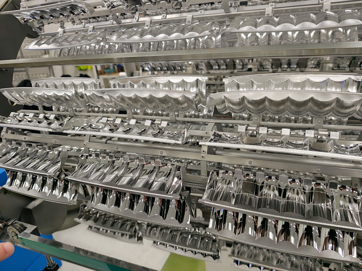 Ein weiteres High-Tech-Verfahren, das Lazer Lamps ins eigene Werk geholt hat, ist die Vakuummetallisierung der Reflektoren. In einer großen Vakuumkammer werden die Kunststoff-Reflektorteile mit Aluminium bedampft – unter Bedingungen „wie im Weltall“, wie die Techniker scherzhaft erklären. Dabei verdampft Aluminium im Hochvakuum und schlägt sich als hauchdünne, hochglänzende Schicht auf der formgenauen Oberfläche nieder. Dieses Verfahren liefert einen extrem gleichmäßigen, spiegelnden Überzug, der mit herkömmlichem Verchromen nicht zu erreichen ist. Weder entstehen unerwünschte Lackschichten noch sammelt sich Material in Ecken – jeder Millimeter des Reflektors bekommt die optimale Beschichtung.