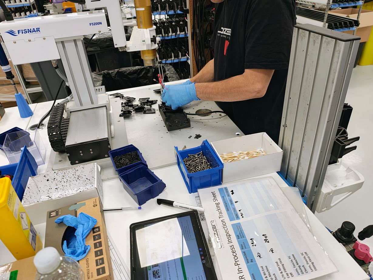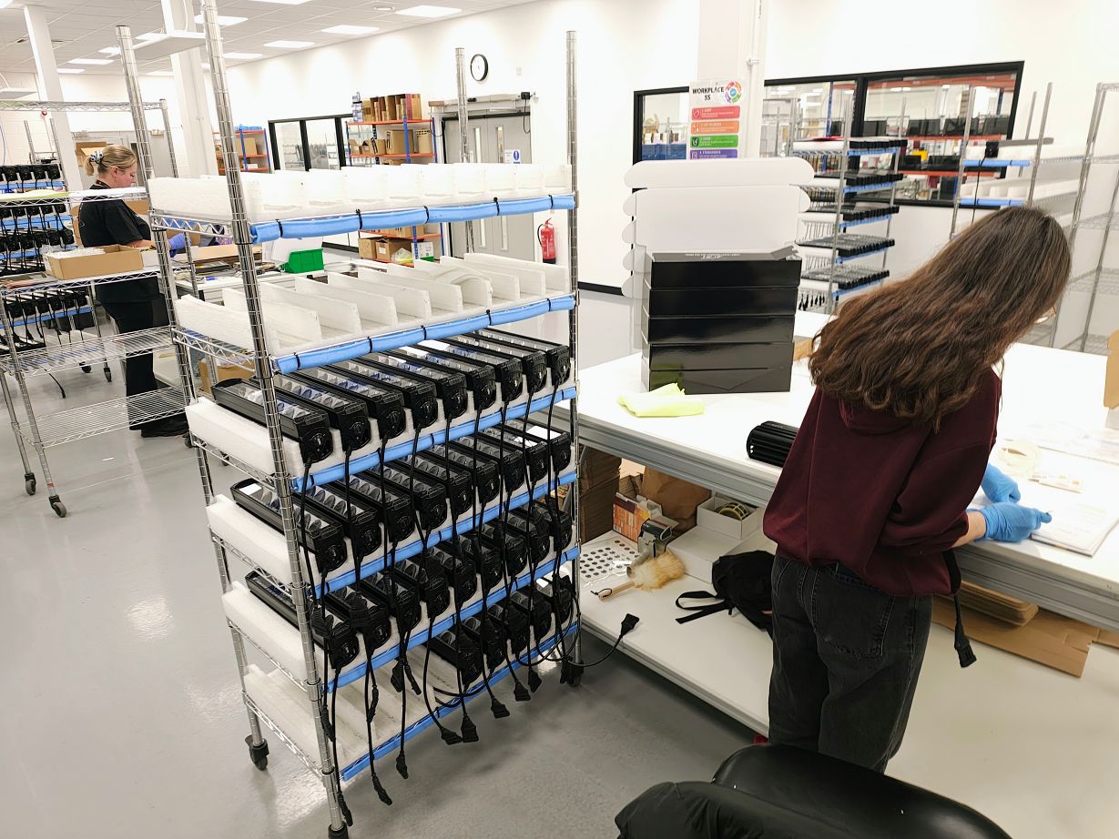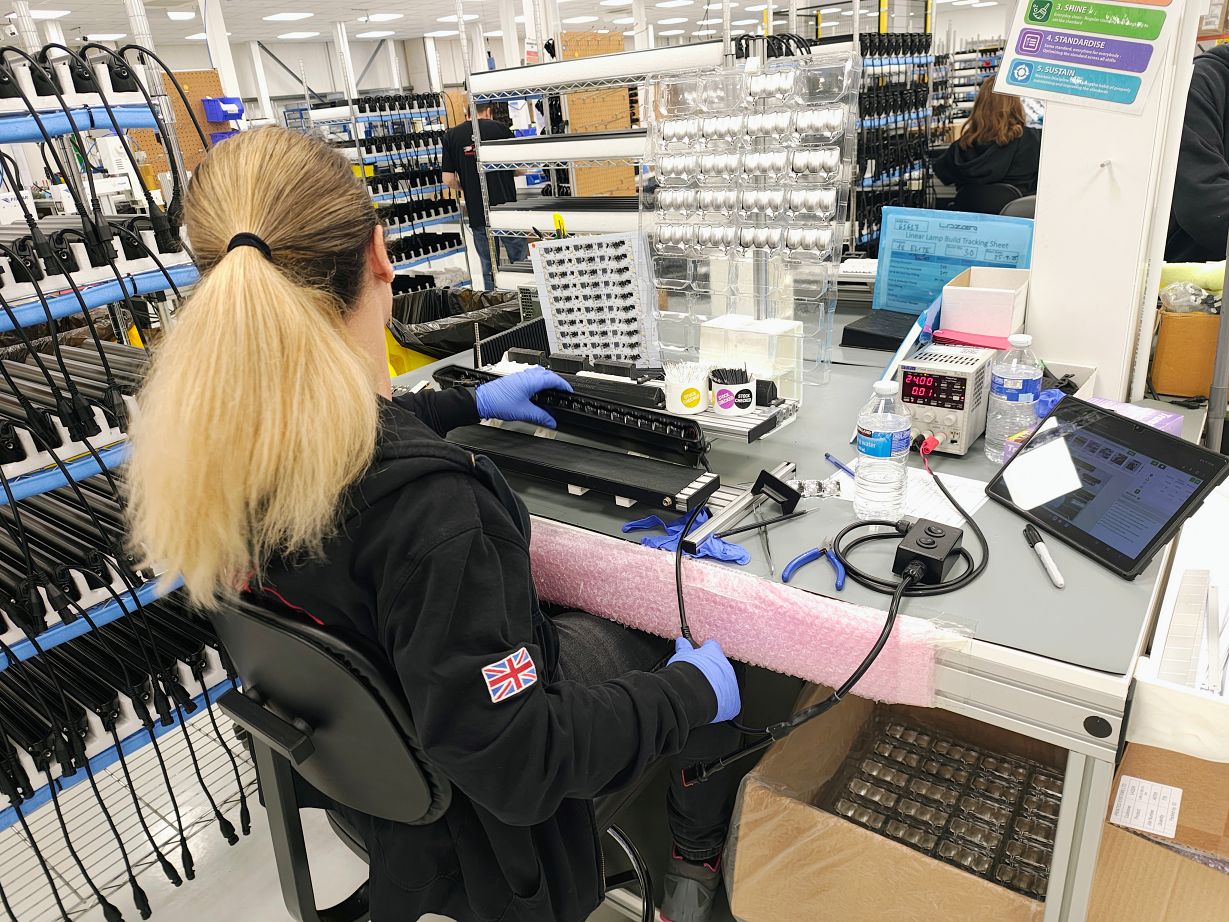 In der Hauptmontagehalle werden die vorbereiteten Komponenten schließlich zu fertigen Scheinwerfern zusammengefügt. Anders als in vollautomatisierten Massenfertigungen setzt Lazer Lamps hier auf flexible Montageinseln und qualifizierte Handarbeit. Je nach Modell kümmern sich einzelne Teams an unterschiedlichen Werkbänken um spezifische Baureihen oder Baugruppen. Die Mitarbeiter arbeiten dabei nach klaren Arbeitsanweisungen, die auf Tablets direkt am Platz verfügbar sind – so wird sichergestellt, dass jeder Schritt nach dem gleichen Standard abläuft.