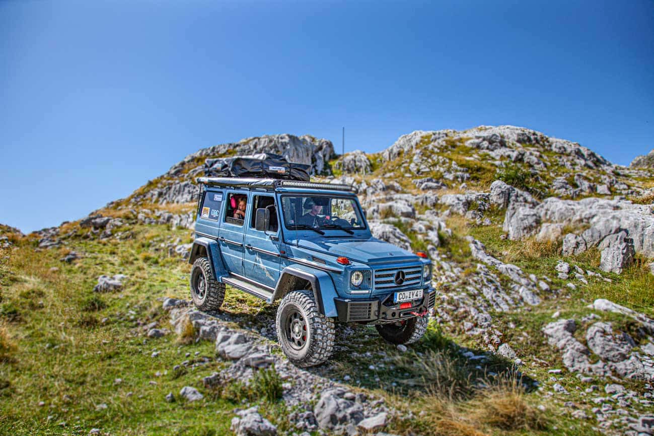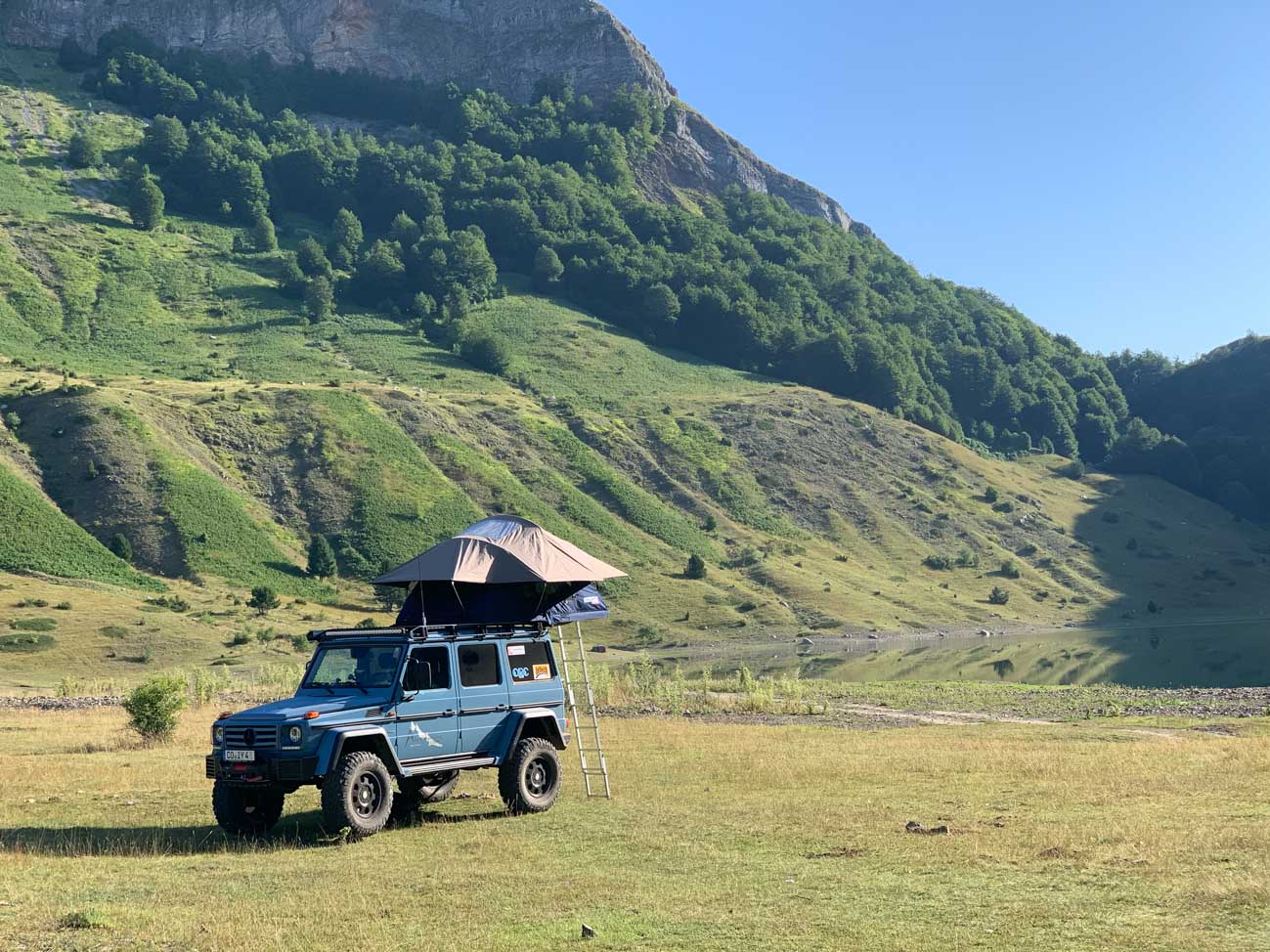 Und im Gelände genutzt wurde der G von Andreas. Eine der ersten Fahrten führte Fahrer und Fahrzeug nach Montenegro zu einer Scout-Tour für das Offroad-Reiseportfolio von Abenteuer4x4. Und da Offroad-Reisen und Outdoor-Leben irgendwie zusammengehören, hat Andi noch ein Dachzelt von Nakatanenga auf dem serienmäßigen Dachträger montiert. Das befindet sich nach dem Umbau auf Portalachsen dort oben zwar in luftiger Höhe, aber wozu gibt es Leitern? Außerdem hat man so gleich am Morgen einen guten Überblick über die Lage.