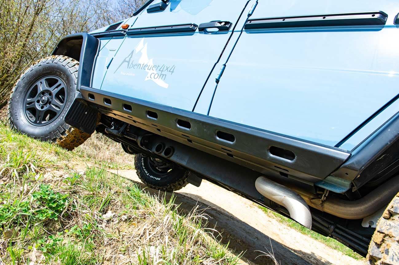Leider passen aber nun die Abenteuer4x4-Rockslider nicht mehr, denn die wurden für die Original-Verbreiterungen konzipiert. Schweren Herzens werden sie daher demontiert und gegen passende Trittbretter ausgetauscht. Immerhin: Die +40-Millimeter-ORC-Federn und die Bilstein-Dämpfer dürfen bleiben. Der LeTech-Unterfahrschutz, die LeTech-Windenstoßstange und die Warn Zeon 10 Platinum sowieso. Haben sie schon voher gut ausgesehen, passen sie auch zum neuen Auftritt von Andis G perfekt. Dass diese Modifikationen an einem echten Geländewagen, der auch als solcher genutzt wird, sinnvoll sind, steht ohnehin außer Frage.