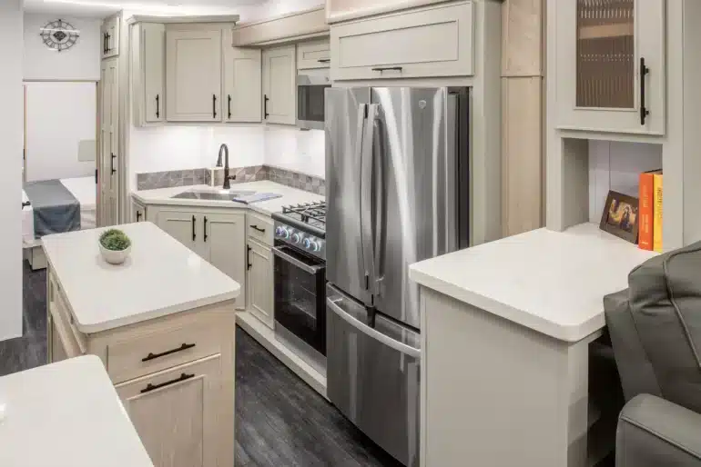 Die Küche ist ein Highlight: Ein 510‑Liter‑Kühlschrank (18 cu ft) mit französischen Türen, ein großer Gasbackofen, ein Edelstahl-Mikrowellen-Kombigerät mit Konvektion und ein Geschirrspüler. Dazu ein tiefes Doppel-Spülbecken, hochwertige Armatur und handverlegter Fliesenspiegel. Arbeitsflächen aus Solid-Surface-Material, optional Quarz. Ein Schrank für Kleingeräte und beleuchtete Vorratsschränke sorgen für Ordnung. Soft-Close-Auszüge und verdeckte Scharniere erhöhen den Komfort – ideal für Vanlifer, die viel kochen und autark unterwegs sind. ([drvsuites.com](https://www.drvsuites.com/rv-model/ms-nashville/))