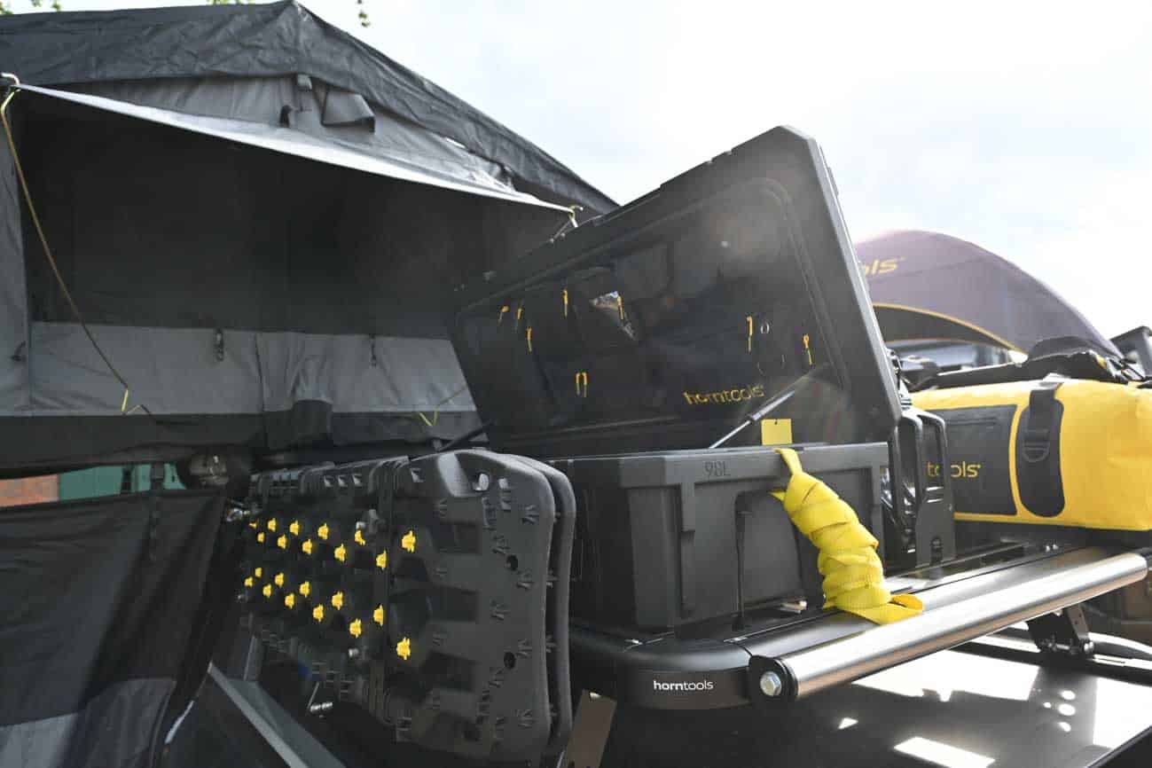 Die Universal-Dachplattform ExRoof ist in vier verschiedenen Größen erhältlich. Alle verfügen über rundum laufende T-Nut-Profile und bestehen aus leichtem und robustem Aluminium. Selbstverständlich kann das komplette ExRoof-Zubehör von Horntools an der Dachplattform verwendet werden. So lässt sich individuell bestimmen, was man benötigt und was nicht.