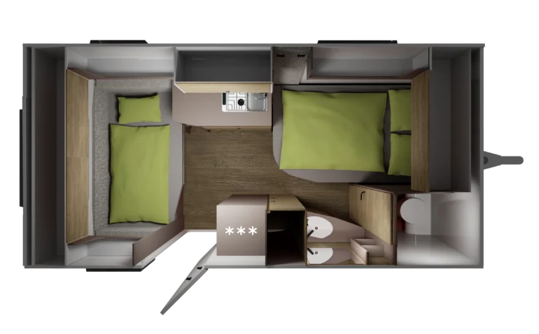 Von außen wirkt der Next 380 zwar klein – knapp sechs Meter lang und 2,19 Meter breit –, doch innen überrascht er mit einer durchdachten Raumaufteilung. Dieser kompakte Caravan bietet Platz für zwei Erwachsene und kann bei Bedarf sogar eine kleine Familie beherbergen. Möglich wird das durch ein fest installiertes Doppelbett an einem Ende und eine gemütliche Sitzgruppe am anderen. Letztere lässt sich mit wenigen Handgriffen in einen dritten Schlafplatz verwandeln. Große Fensterflächen sorgen dabei für ein luftiges Raumgefühl und viel Tageslicht. Trotz der geringen Größe mussten weder Komfort noch Gemütlichkeit leiden. Das Interieur ist modern gestaltet, hell und funktional, ohne dabei kalt zu wirken.