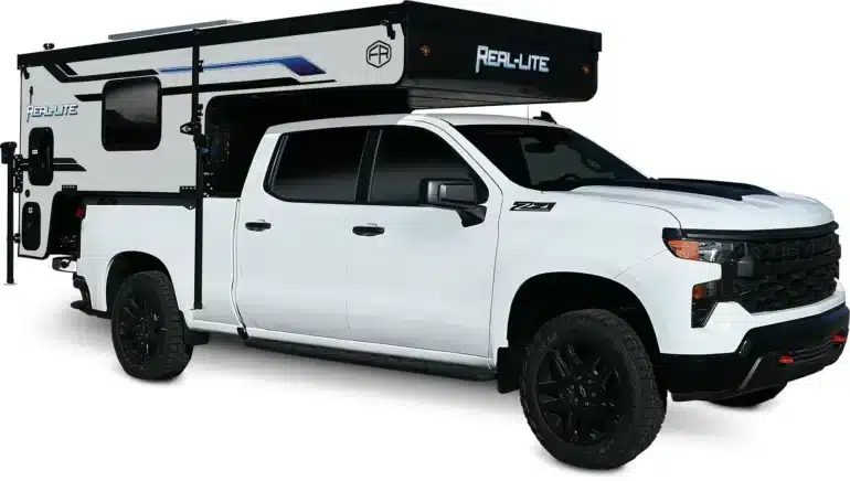 Die gängigen Optionen des Real-Lite unterstreichen seine Vielseitigkeit. Bei den Soft-Side-Modellen sind elektrische Stützen, eine 9×12-Fuß-Mondschatten-Markise oder ein Dachgepäckträger beliebt, die das Campen erleichtern. Für Hard-Side-Varianten locken Seitenvorzelte mit LED-Lichtern oder ein Euro-Bett, das zusätzlichen Schlafraum schafft. In der MAX-Serie runden – je nach Modell – Theater-Sitze oder ein Klapptritt im Schlafbereich das Angebot ab. Solche Ergänzungen passen nahtlos in den Vanlife-Lebensstil, wo Anpassungsfähigkeit zählt. Ob du einen Dually-Halter für breitere Trucks brauchst oder einen Außengrill für Barbecues – der Camper wächst mit deinen Bedürfnissen. Das macht ihn zu einem langfristigen Partner für Reisen, die von spontanen Wochenenden bis zu monatelangen Abenteuern reichen.