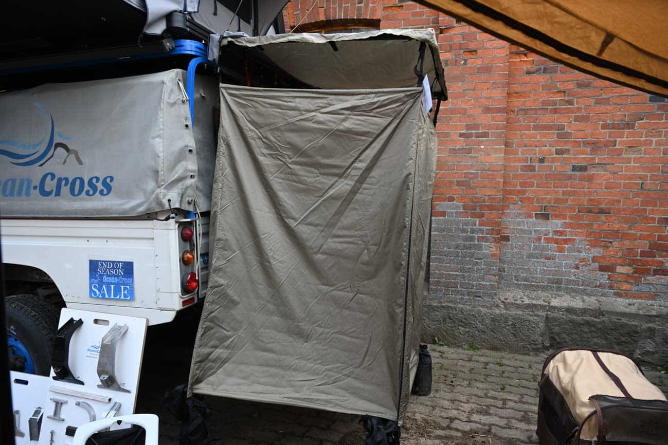 Doch zurück zur Adventure Northside und unserem Besuch auf dem Ocean-Cross-Messestand. Denn dort haben wir eine ganze Menge tolle Produkte entdeckt, die jeder Camper brauchen kann. Da sind zum einen natürlich die Dachzelte der Marke, die einem sofort ins Auge springen. Etwas weiter hinten auf dem Stand fiel unser Blick dann als erstes auf ein Duschzelt, das man zum Beispile an einem Dachträger befestigen kann. Und da das Zelt keinen Boden hat, ist es fast schon egal wie hoch der über dem Boden trohnt. Geduscht wird dann eben in passenden Badelatschen.