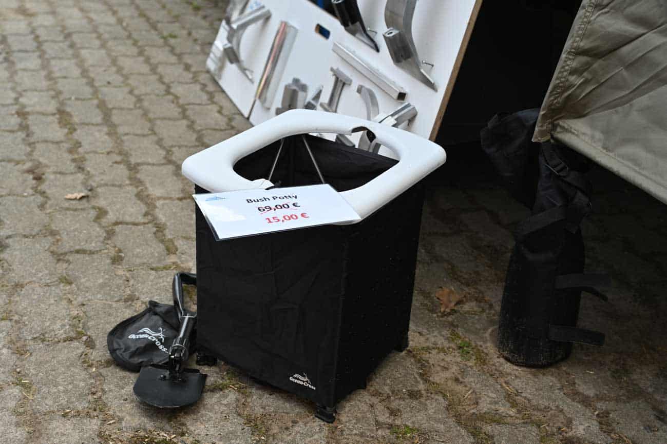 Wer will, kann das Zelt aber auch als Toilettenzelt nutzen. Die Klapp-Toilette gibt es natürlich ebenfalls. Messepreis 15 Euro, Angebotspreis auf der Webseite 17 Euro. Hinzu kommen die Kosten für eine Tüte, Einstreu und Toilettenpapier. Günstiger ist nur noch ein Plastikeimer.