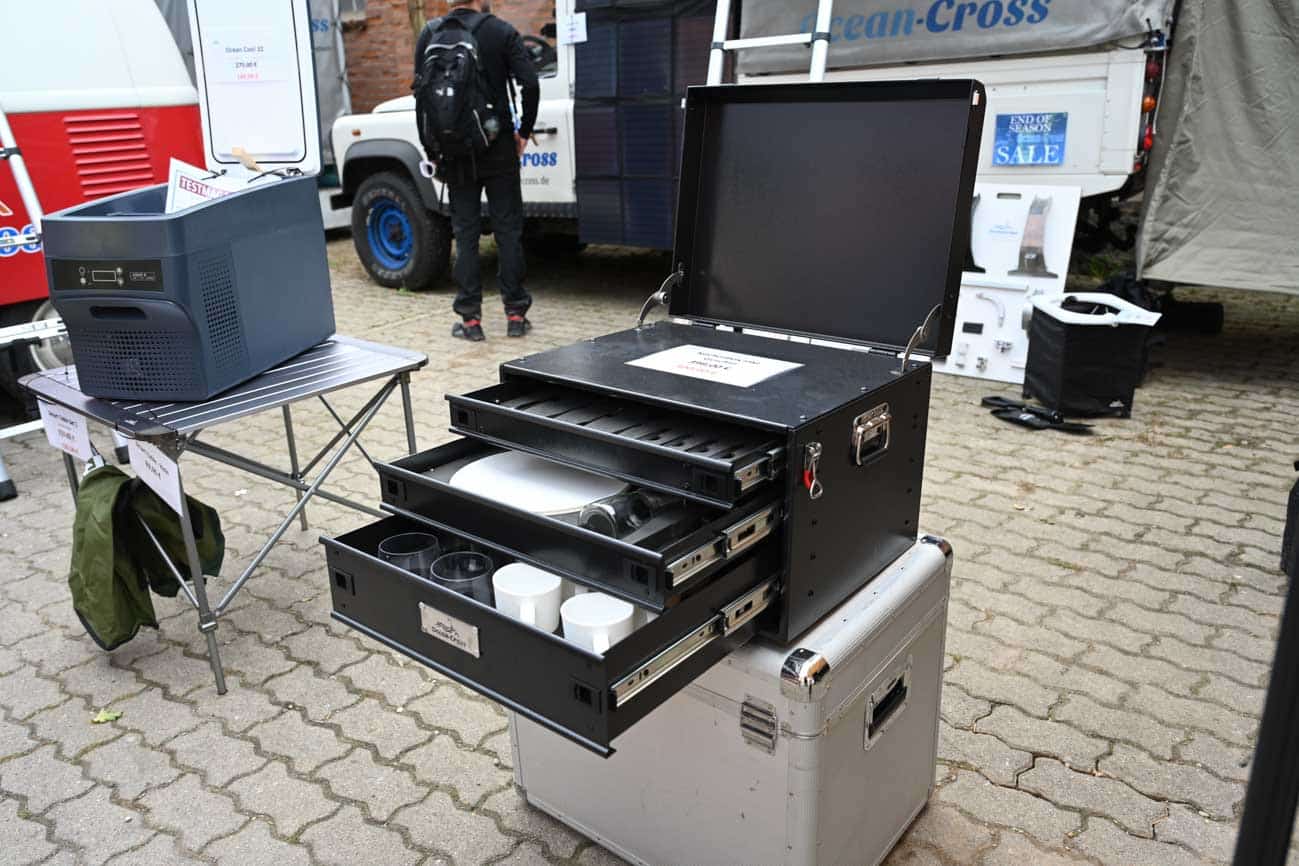 Vom Duschzelt wandern wir auf dem Stand weiter zu den Dingen, die jeder Camper braucht: Basics für die Küche. Und auch da haben die Camping-Spezialisten einiges zu bieten. Zum Beispiel eine mobile Küchenbox, die mit Tellern, Bechern und Besteck ausgestattet ist. Der Kocher findet obendrauf Platz, gehört aber nicht zur Ausstattung. Klar, wer bereits Teller, Tassen & Co. sein Eigen nennt, der wird den Inhalt nicht unbedingt benötigen, aber die Box aus solidem Metall ist wirklich klasse und mit einem aktuellen Angebotspreis von 300 Euro ziemlich günstig. Das Gewicht liegt übrigens bei 18 Kilo.