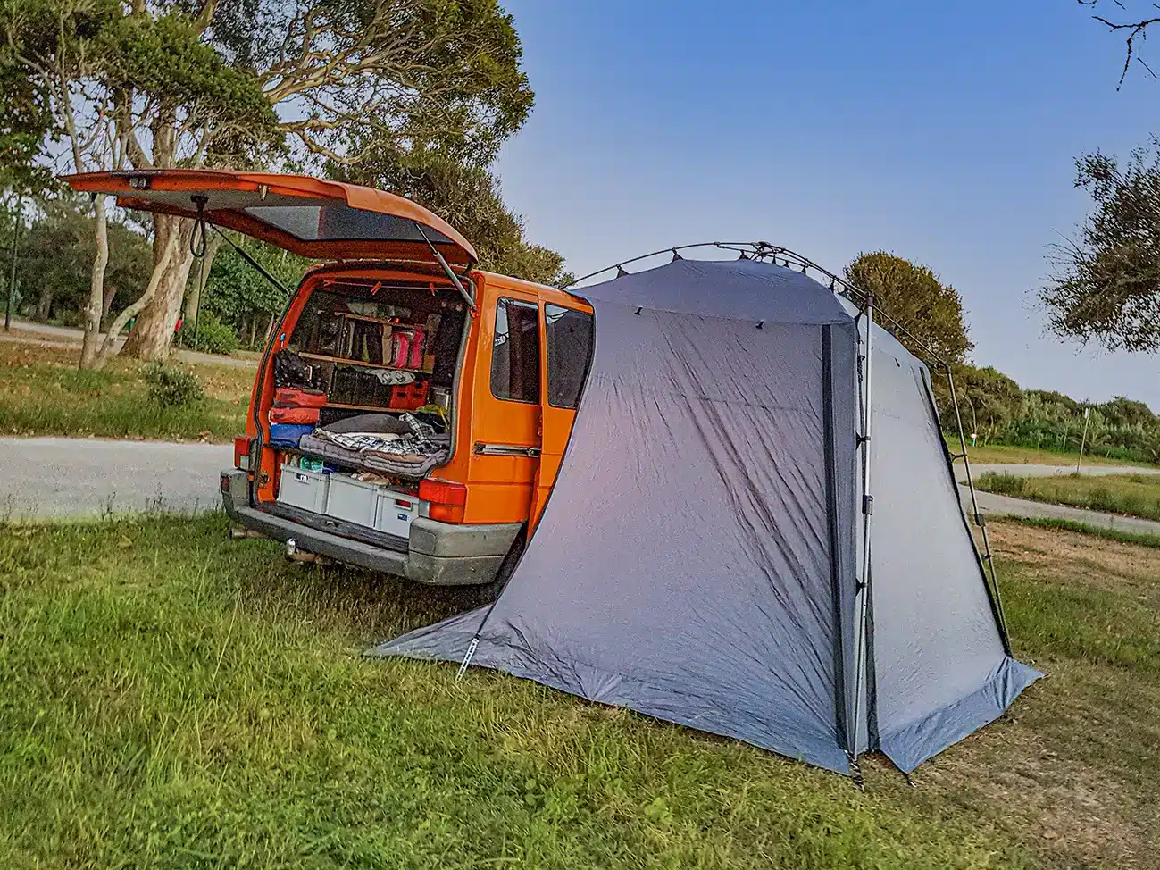 Und dass die Qualität stimmt, davon konnten wir uns bereits selbst überzeugen. Denn zum einen haben wir das Dachzelt Ocean Cross Gobi 140 bereits 2022 getestet und zum anderen hatten wir uns für unseren ersten Bulli mit seinem Low-Budget-Ausbau ein Vorzelt von Ocean Cross gekauft, das wir auf unseren Reisen oft benutzt haben. Das Vorzelt ist mit uns bis nach Portugal gereist und hat Wind und Wetter standgehalten. Und das Beste: Es war nicht wirklich teuer.
