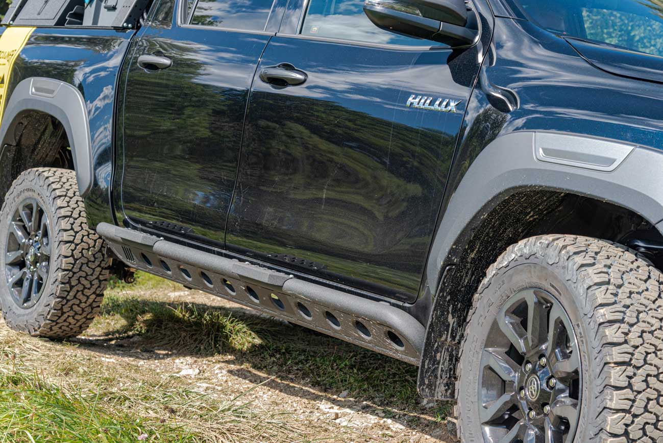 Die Seiten der Karosserie werden vom Horntools-Rockslider Lapis vor Beschädigungen durch Felsen, Baumstümpfe oder sonstige Hindernisse, die bei Kontakt nicht nachgeben, geschützt. Eine absolut sinnvolle Investition, wenn man mit seinen 4×4-Camper ins heftigere Geräde will, um dahin zu kommen, wo andere garantiert nicht hinterherkommen und man die Welt für sich hat.