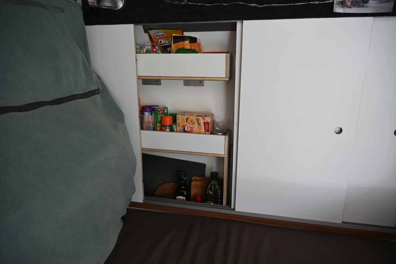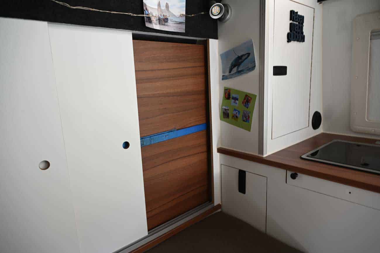 Gleich links neben der Spüle, an der Stirnwand, befindet sich ein Schrank für Geschirr, Kochtöpfe und den Omnia-Backofen. Ein Teil der Lebensmittel kann hinter einer Schiebetür, die einen weiteren Schrank an der Kabinenfront freigibt, verstaut werden. Hinter einer zweiten Schiebetür verbirgt sich die Platte für den Tisch, die auch als Unterlage für das Doppelbett dient. Denn das muss natürlich abends gebaut werden.