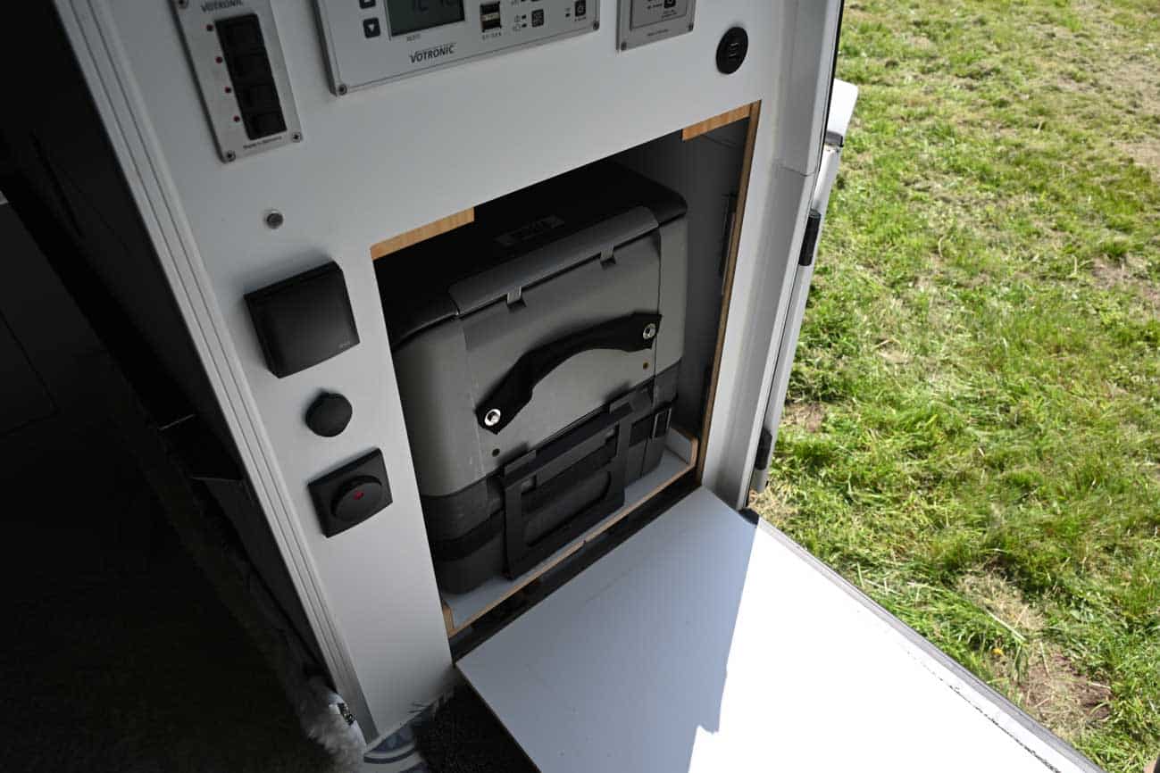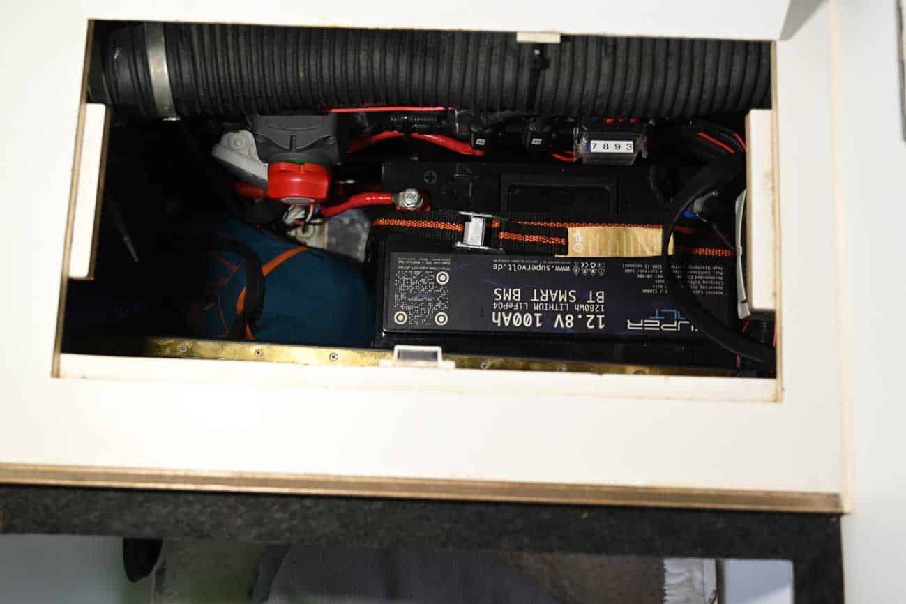Und klar, auch an das Thema Strom haben die beiden gedacht. Solarmodule von Sunbeam auf dem Dach und der rechten Seite der Kabine liefern gesamt 230 Watt. Die fließen in eine LiFePo-Aufbaubatterie von Supervolt mit 100 Amperestunden. Das reicht für die Kühlbox, das Licht und zum Laden von Handy & Co.
