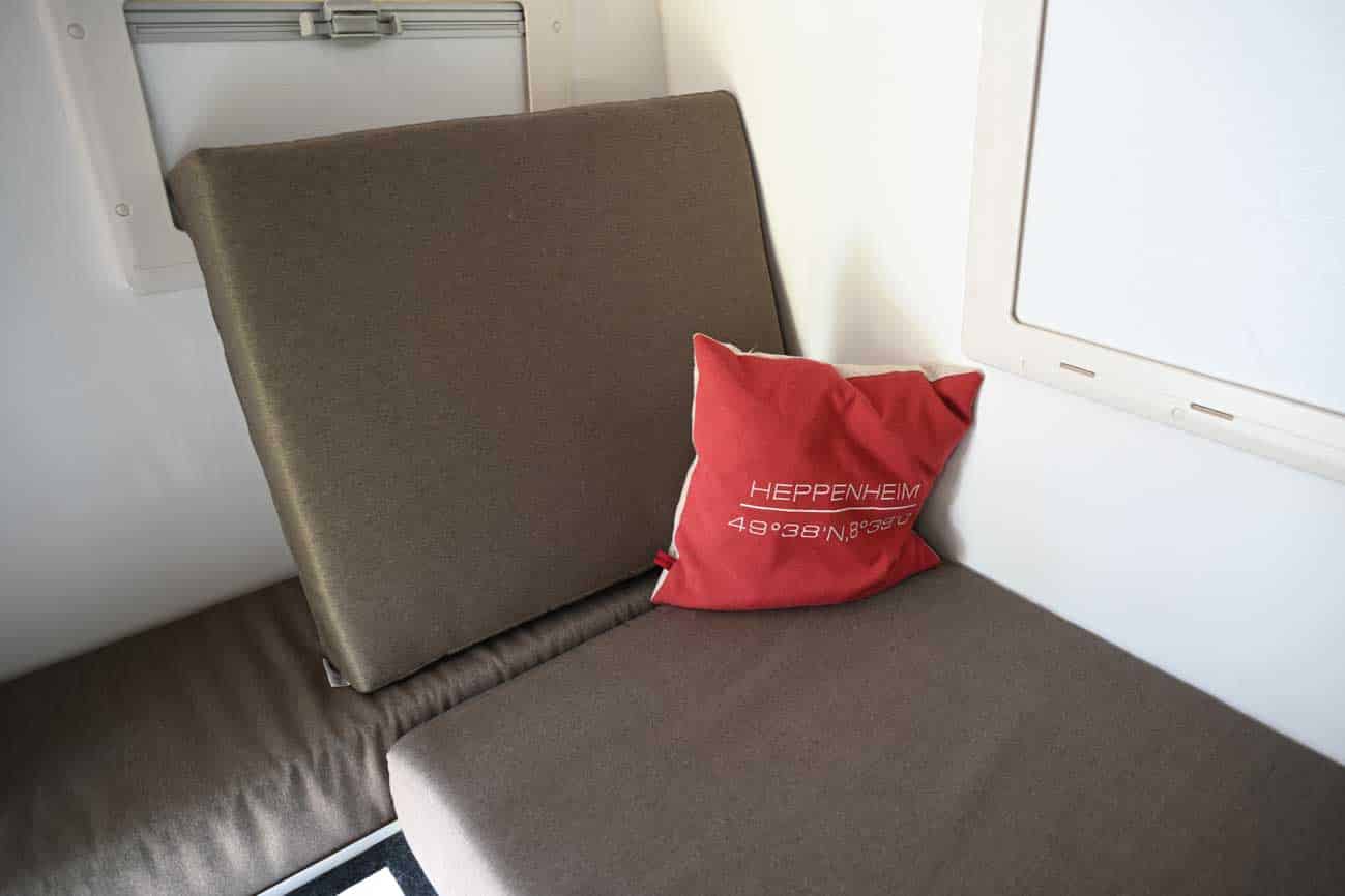 Tagsüber ist die eine Hälfte Sitzecke. Das Bettzeug verschwindet dann in einer Tasche, die an der linken Seitenwand hängt. Die Möbel bestehen übrigens aus superleichtem Balsaholz mit HPL-Beschichtung.