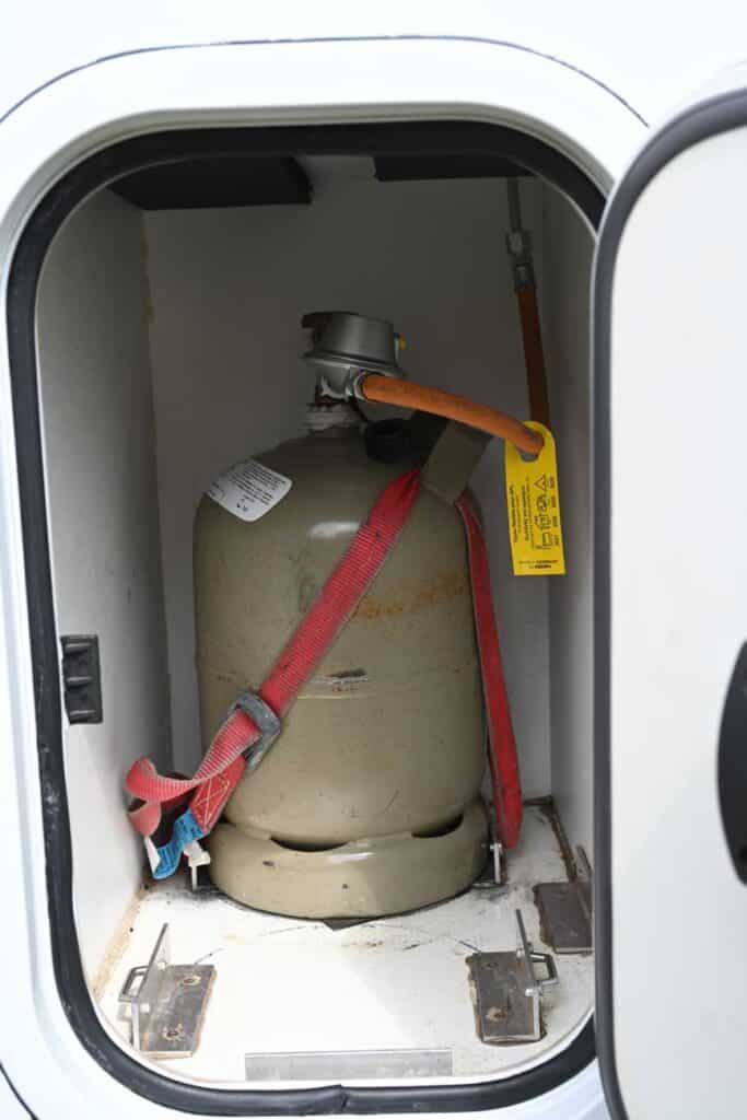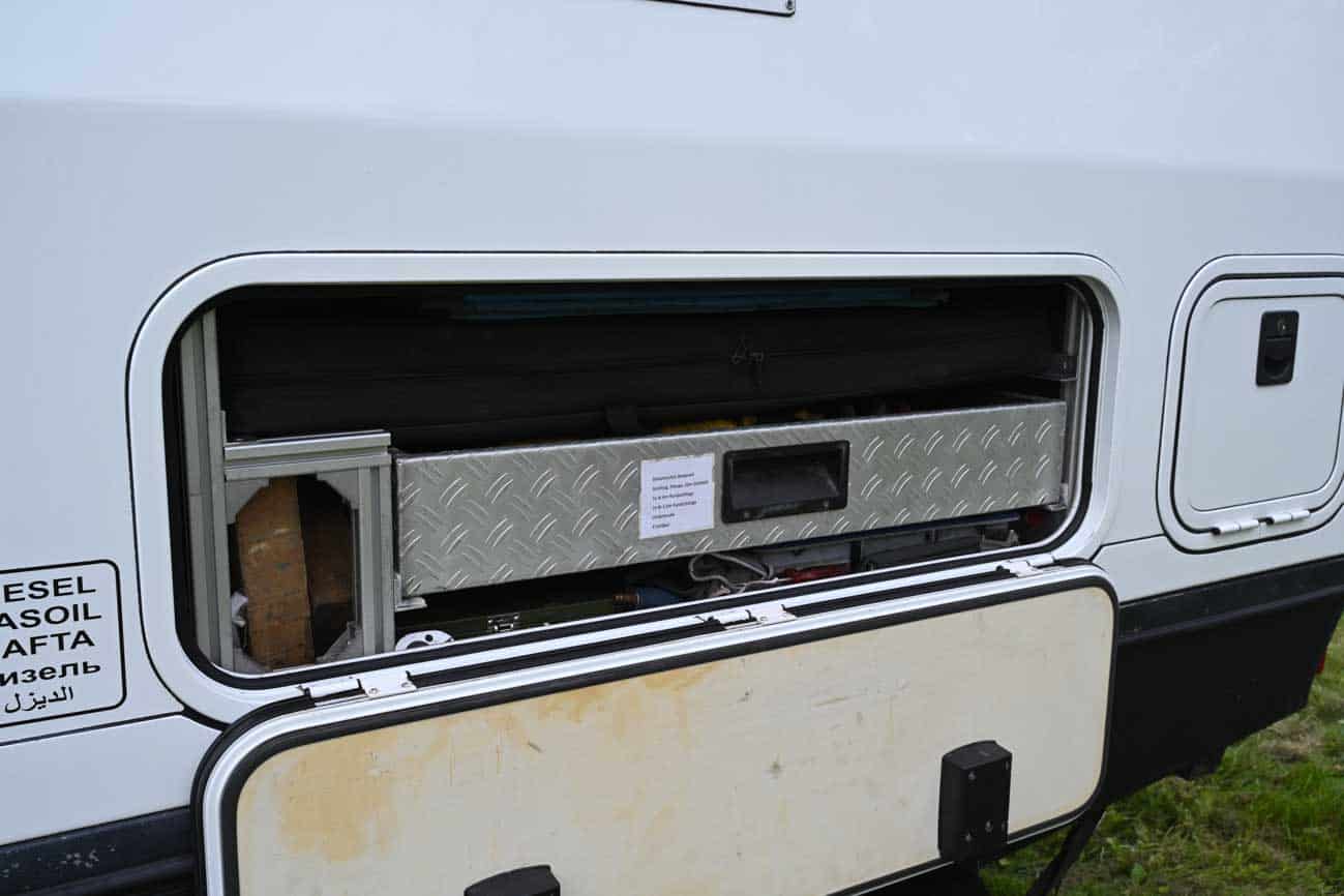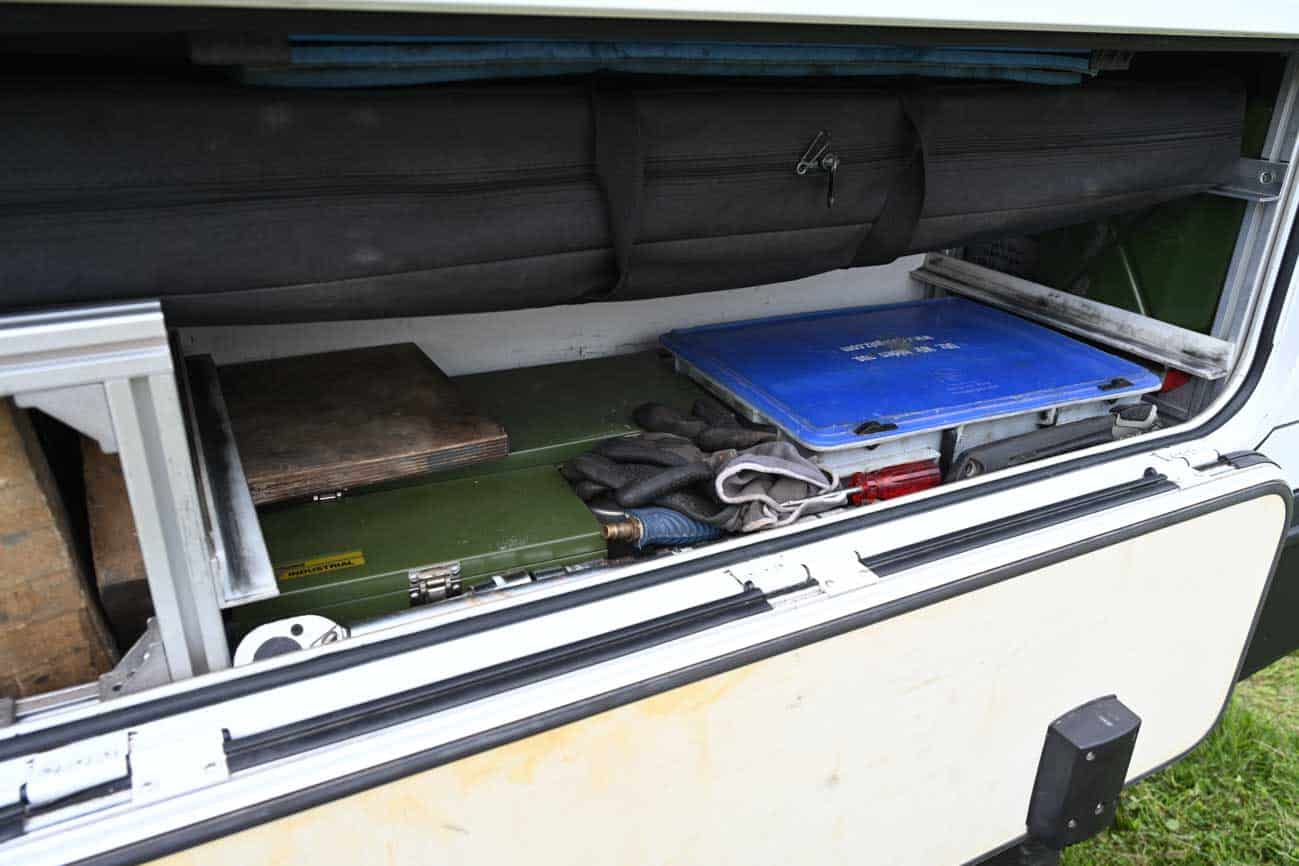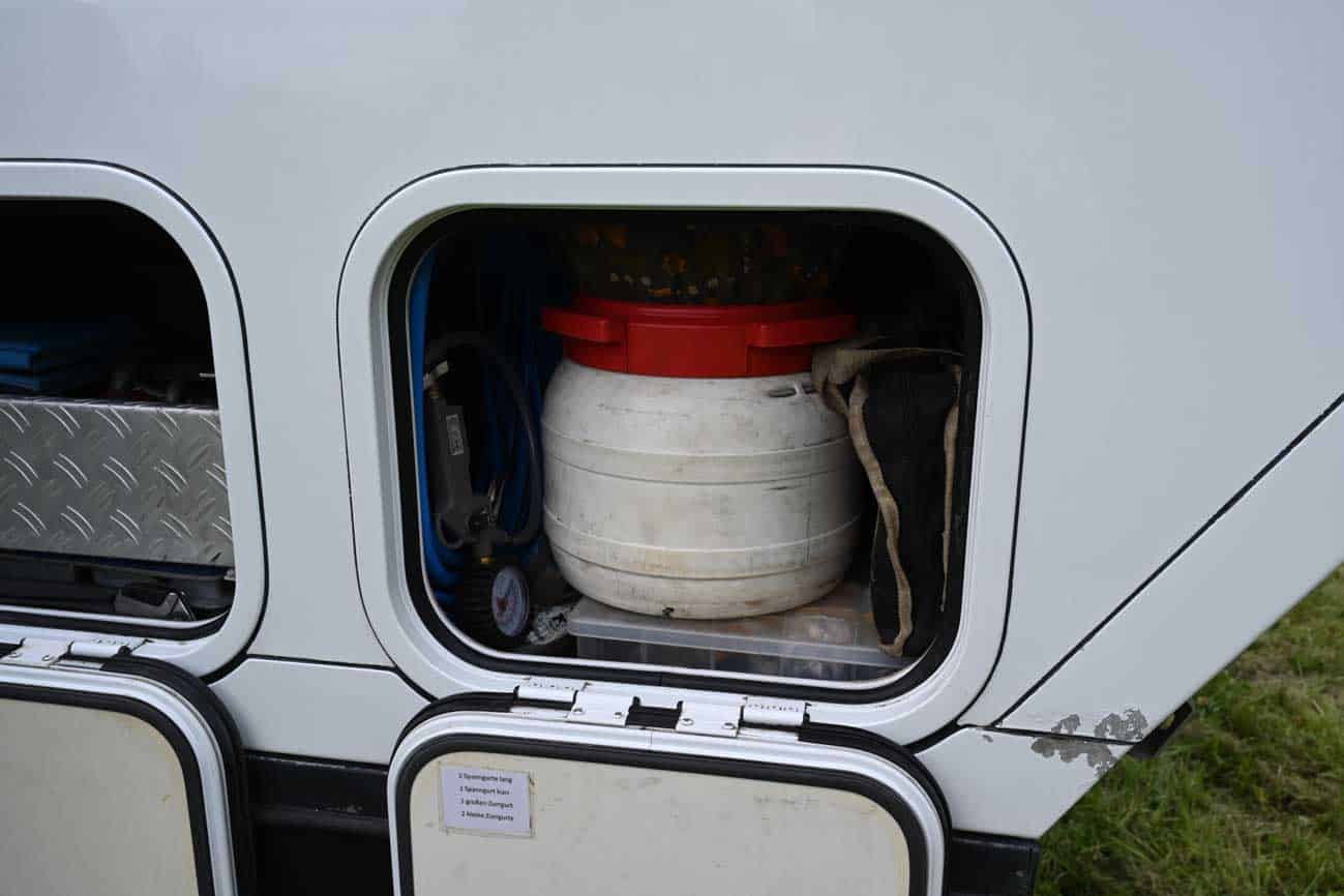 Hinter einer weiteren Klappe verbirgt sich ein Weithals-Rundkanister, der auch als Waschmaschine dient. Hinter einer anderen Klappe sind die Gasflaschen untergebracht. Hier handelt es sich um eher seltene Drei-Kilo-Campinggasflaschen. Davon haben aber zwei Stück im Fach Platz. Die sechs Kilo reichen den beiden allerdings in der Regel aus.