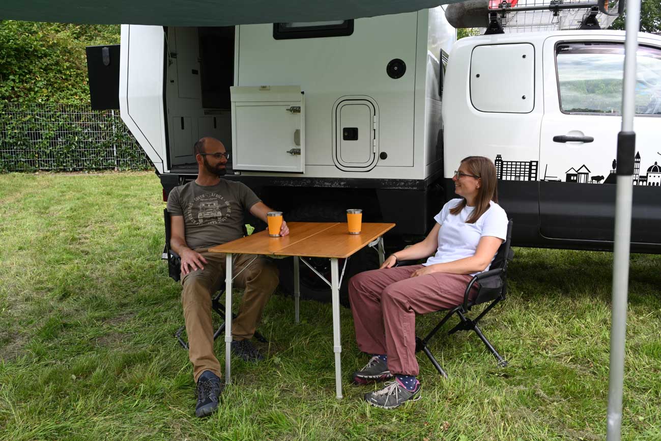 Ja klar, wenn man in der Wohnkabine nur wenig Platz hat, findet ein Großteil des Lebens draußen in der Natur statt. So auch bei Linda und Hanjo. Campingstühle, ein kleiner Tisch und natürlich ein Grill sind daher selbstverständlich mit an Bord. Damit die beiden vor zu viel Sonne oder auch mal vor einem Regenschauer geschützt draußen sitzen können, ist noch ein Tarp an Bord, das in einer Kederschiene eingezogen und mit Stangen und Schnüren abgespannt wird.