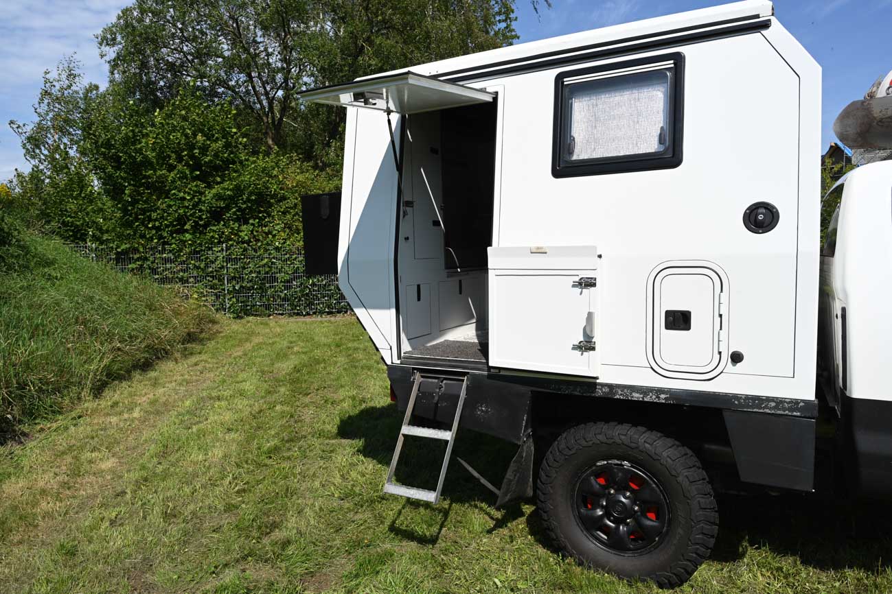 Um die Antwort vorwegzunehmen: Beide sind nach wie vor rundum glücklich und zufrieden mit ihrer Pickup-Kabine. Laut ihrer Aussage passt sie so, wie sie sie gebaut haben perfekt und es gibt nichts, was man ändern muss. Eine Aussage, die uns erstaunt aber auch erfreut. Gut, es gab ja auch schon einen ersten Wurf. Der war dann also quasi zum Üben. Bei dieser zweiten Kabine haben sie dann die Dinge „korrigiert“, die beim Vorgänger nicht gepasst haben.