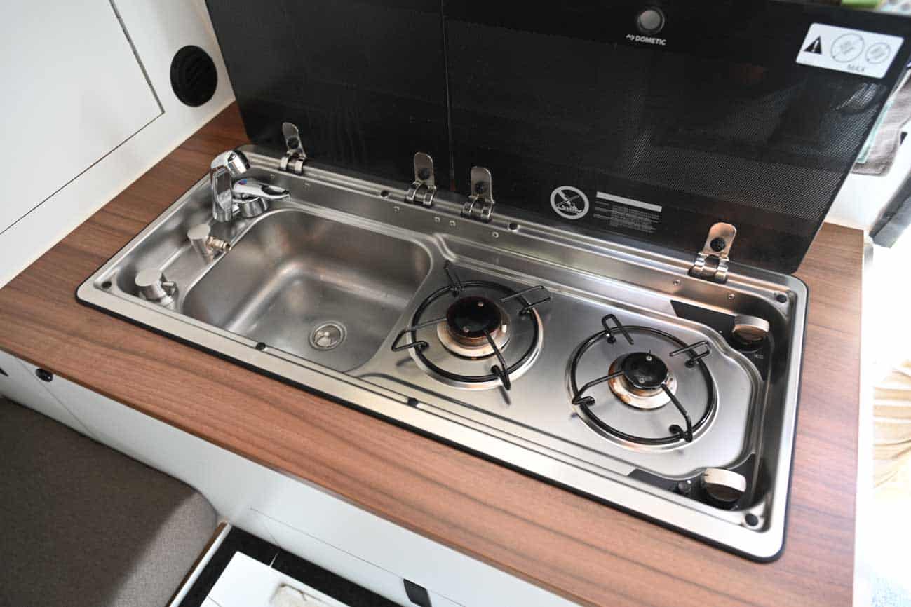 Aufgeklappt ist das Dach schnell. Hinten zwei Verschlüsse lösen, das Dach von innen leicht hochdrücken und dann geht es dank zweier Gasdruckfedern von alleine. Ist das Dach offen, hat man – bis auf ganz vorne – Stehhöhe. Auch vor der Küchenzeile, die seitlich rechts untergebracht ist. Sie beinhaltet einen Zweiflamm-Gasherd und eine Spüle, die auch über einen Anschluss für einen Duschschlauch verfügt. Die Brause wandert dann durch das Fenster nach draußen. Unter Spüle und Kocher befindet sich die Kühlbox. Sie wird seitlich in die Türöffnung herausgezogen.