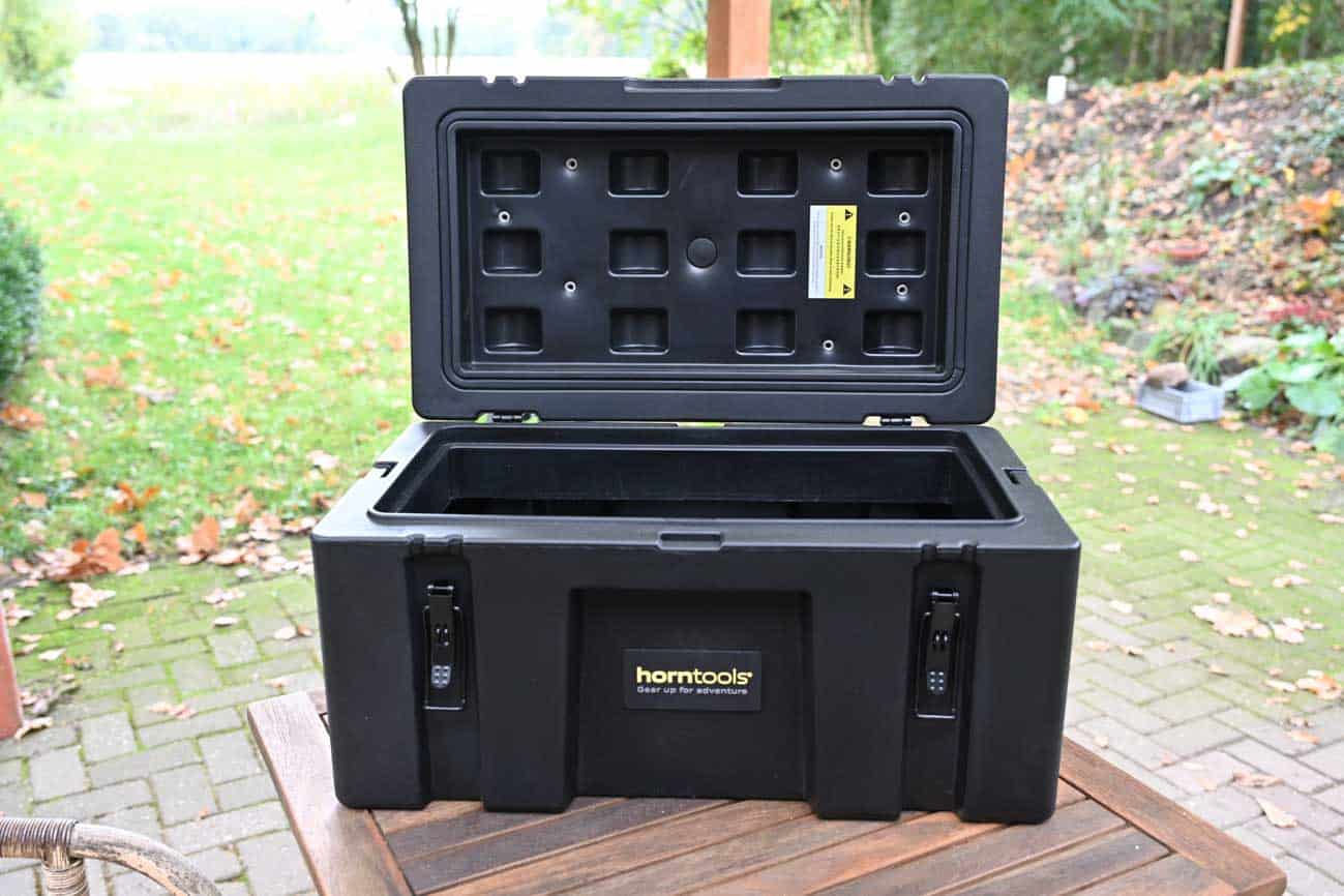 Aber natürlich kann man so eine Transportbox auch im Fahrzeuginneren verwenden. Vor allem dann, wenn man sie immer mal wieder herausnimmt und draußen hinstellt, weil man etwas herausnehmen oder sie als Sitzgelegenheit nutzen will. Denn auch das geht natürlich, robust genug ist die Horntools-Box allemal. Von der Art erinnert sie an die stabilen Kunststoffboxen, die das US-Militär in verschiedensten Größen für seine Ausrüstung verwendet.