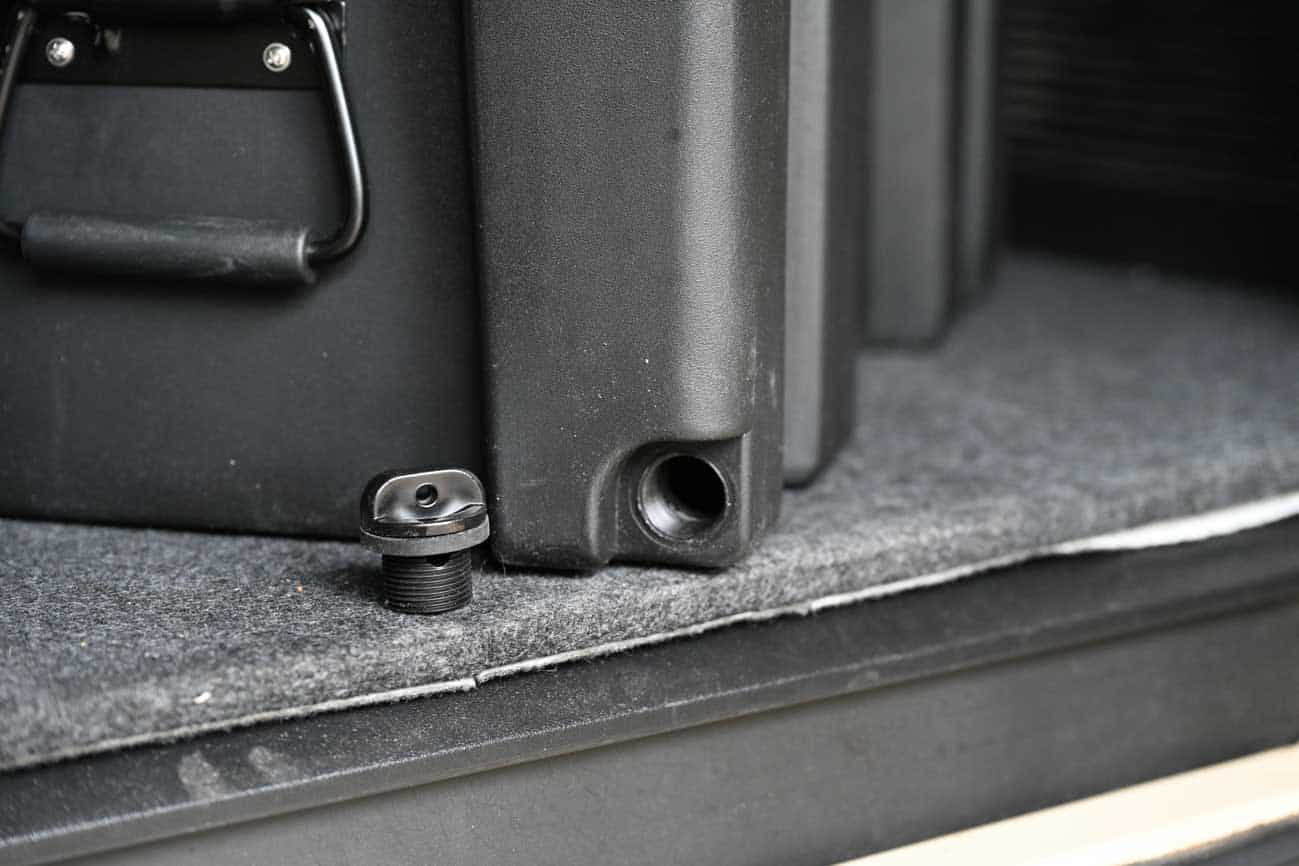 Während die US-Boxen jedoch über ein Ventil verfügen (im Bild über dem rechten Handgriff rechts über dem Verschluss), um vor dem Öffnen einen eventuell entstandenen Unterdruck auzszugleichen, damit man die Kiste öffnen kann, verfügen die Horntools-Boxen über einen Ablass. Er ist mit einer Kunststoff-Schraube verschlossen. Sollte man die Box also tatsächlich nicht öffen können, schraubt man hier einfach auf. Der Ablass ist auch perfekt, um die Transportbox innen ordentlich mit Wasser zu reinigen. Anschließend kann es durch die Öffnung einfach ablaufen.