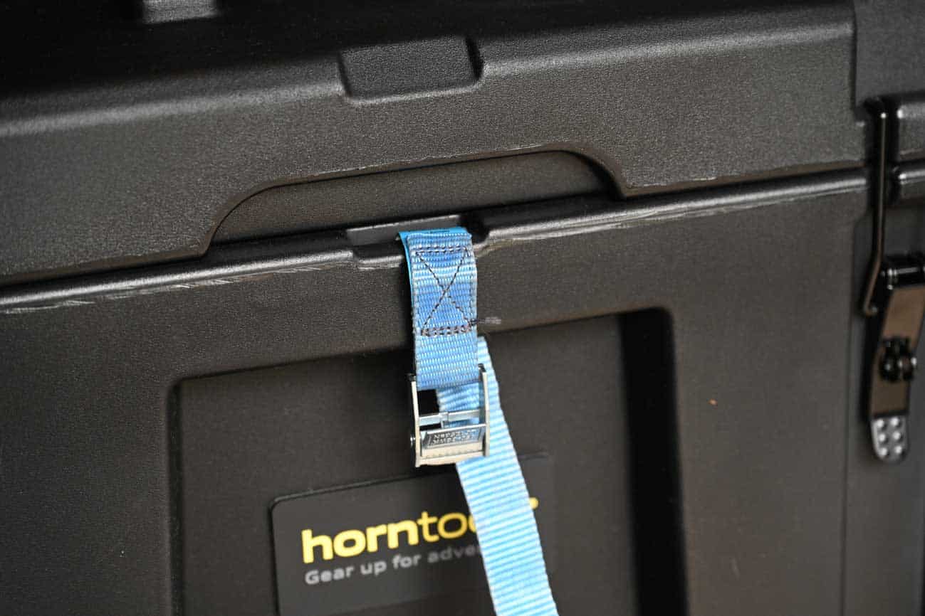 Die Horntools-Transportbox verfügt deshalb über vier Befestigungsösen: eine jeweils mittig an jeder Seite. Sie befinden sich am oberen Rand der Kiste direkt unter dem Deckel. Hier kann ein Gurt durchgezogen und die Box so verspannt werden. Ist der Deckel geschlossen, wird der Gurt nicht eingeklemmt, kann also weiterhin problemlos durchgezogen werden. Perfekt, denn so lässt sich die Horntools-Transportbox ausreichend gegen Verrutschen sichern.