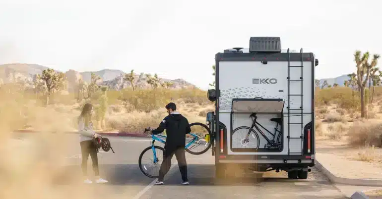 Das spannendste Detail des Winnebago EKKO sitzt ganz hinten: die beheizte Heck-Gear-Garage. Dieser Stauraum orientiert sich eher an einem Expeditionsfahrzeug als an einem klassischen Wohnmobil. Hier lassen sich Bikes, Kajaks und andere große Ausrüstungsteile sicher verstauen. Ein L-Track-Zurrschienensystem ermöglicht flexible Befestigungspunkte – wer schon einmal versucht hat, ein teures Mountainbike in einer normalen Heckgarage notdürftig mit Spanngurten zu sichern, weiß, wie viel Nerven ein durchdachtes System spart.