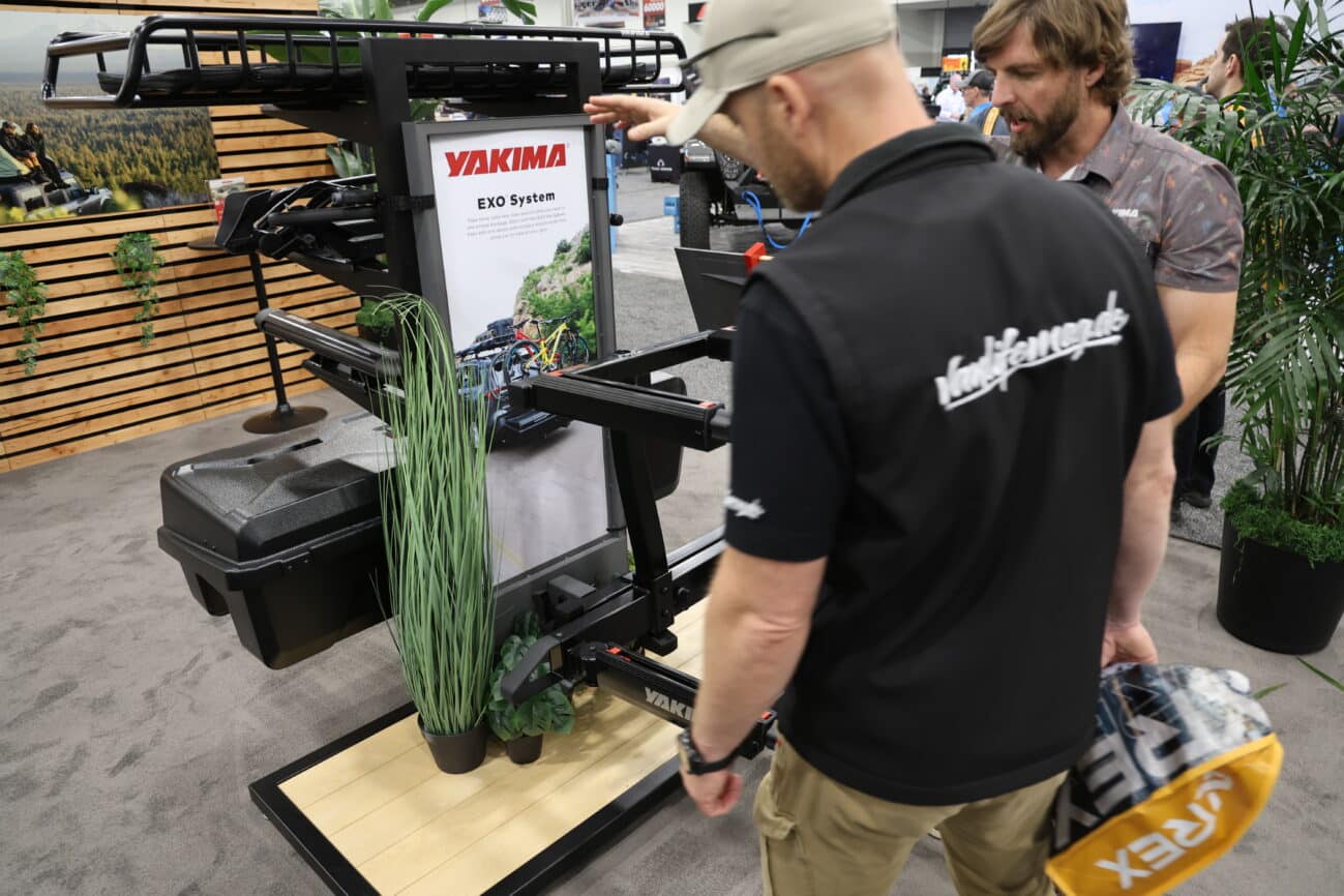 Ein weiteres Highlight, das Yakima in Las Vegas präsentiert, richtet sich an alle, die Stauraum im Fahrzeug clever organisieren wollen – vom Geländewagen bis zum Campervan. Das Yakima MOD-System ist ein neues modulares Schubladensystem für den Kofferraum bzw. Ladefläche. Im Gegensatz zu herkömmlichen Fahrzeugeinbauten erfordert MOD keine dauerhafte Installation oder Bohrungen. Es besteht aus einer Basisplattform (HomeBase) und darauf stapelbaren Schubladenmodulen, die sicher miteinander verriegelt werden. Die gesamte Einheit kann jedoch mit wenigen Handgriffen wieder aus dem Fahrzeug entnommen werden, wenn man den Platz anderweitig benötigt. „Das Besondere ist, dass unser System nicht am Fahrzeug verschraubt wird – man kann es jederzeit rausnehmen, zum Beispiel nach der Reise“, erklärt Eric Rosinger. Flexibilität steht im Vordergrund: Heute auf Offroad-Tour mit Werkzeug, Ersatzteilen und Campingausrüstung in den Schubladen; morgen die Module herausheben, um den Van für den Umzug oder den Baumarkt-Einkauf freizumachen. Jede Schublade ist mit bis zu ca. 45 kg beladbar, auf der Oberseite der Plattform sind etwa 110 kg Traglast möglich – genug, um weiteres Gepäck darüber zu stapeln. Yakima demonstriert am Messestand, wie im offenen Jeep Wrangler das MOD-System eine abschließbare Aufbewahrung bietet – ein wichtiger Punkt, da offene Fahrzeuge sonst wenig Diebstahlschutz bieten. Durch Nachrüst-Schlösser (SKS-Schließzylinder, Yakima-Standard) lassen sich die Schubladen verriegeln.