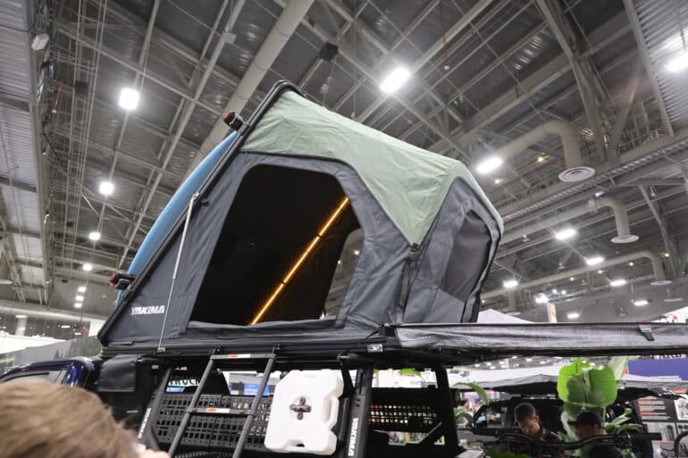 Weiter geht es hoch hinaus – im wahrsten Sinne: Yakima enthüllt auf der SEMA sein erstes Hartschalen-Dachzelt, das SkyPeak HD. Dieses Dachzelt wurde als robustes „Dachgepäckträger zum Drin-Schlafen“ entwickelt, wie Yakima-Mann Chris Horton betont. Tatsächlich erfüllt das SkyPeak höchste Ansprüche an Stabilität und Funktionalität: Die harte Oberschale besteht aus Aluminium-Wabenmaterial statt einfachem ABS-Kunststoff, was Langlebigkeit und geringes Gewicht vereint. Auf der Ober- und Unterseite des Zelts verlaufen integrierte T-Nut-Schienen. Hier lassen sich zusätzliche Lasten bis zu 136 kg montieren – etwa Fahrräder, Kajaks oder Solarpaneele. Ein kräftiges Scherenscharniersystem mit Gasdruckdämpfern sorgt dafür, dass selbst beladenes Equipment beim Aufklappen mit nach oben schwenkt. So können Vanlife-Abenteurer ihre Sportausrüstung auch dann montiert lassen, wenn das Zelt aufgebaut ist – ein einzigartiges Feature. Das SkyPeak HD öffnet sich als Keilzelt mit einem zusätzlichen Ausstellsegment, wodurch im Inneren eine komfortable Stehhöhe von gut 1,70 m erreicht wird. Drei Eingänge (jeweils mit Leiteraufnahme) ermöglichen den Zugang von allen Seiten. Innen offenbart sich Yakimas Liebe zum Detail: Dimmbares LED-Licht in Weiß und Amber, duale Kabelführungen für Strom oder eine Heizung, Netztaschen und ein 6 cm dicker Memoryfoam-Matratzenschlafboden gehören zur Serienausstattung. Zudem setzt Yakima auf Blackout-Gewebe – das Zeltmaterial dunkelt ab, sodass weder frühe Sonne noch spät heimkommende Campnachbarn den Schlaf stören. Für Familien und Gruppen bietet das SkyPeak üppigen Platz: Es ist breiter und länger als viele Konkurrenzmodelle und sofort „out of the box“ einsatzbereit mit allem Zubehör. Die Leiter verdient besondere Erwähnung: Yakima hat sie mit extrabreiten, ergonomisch geformten Sprossen ausgestattet, die auch barfuß bequem zu begehen sind – eine spürbare Verbesserung gegenüber den schmalen Leitern mancher Mitbewerber.