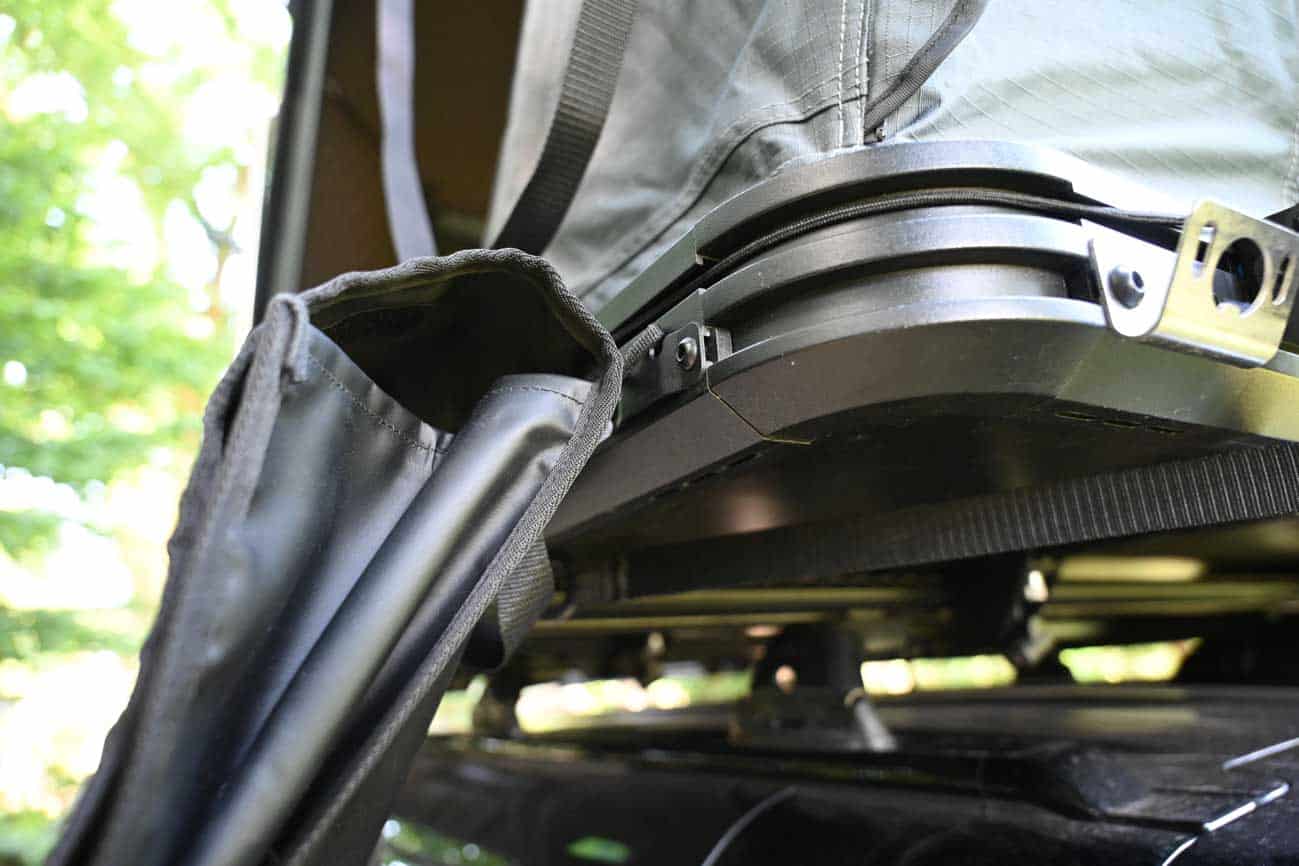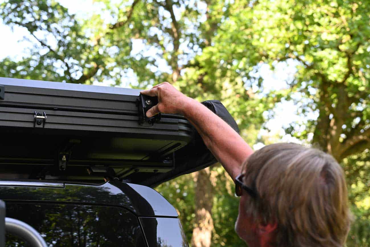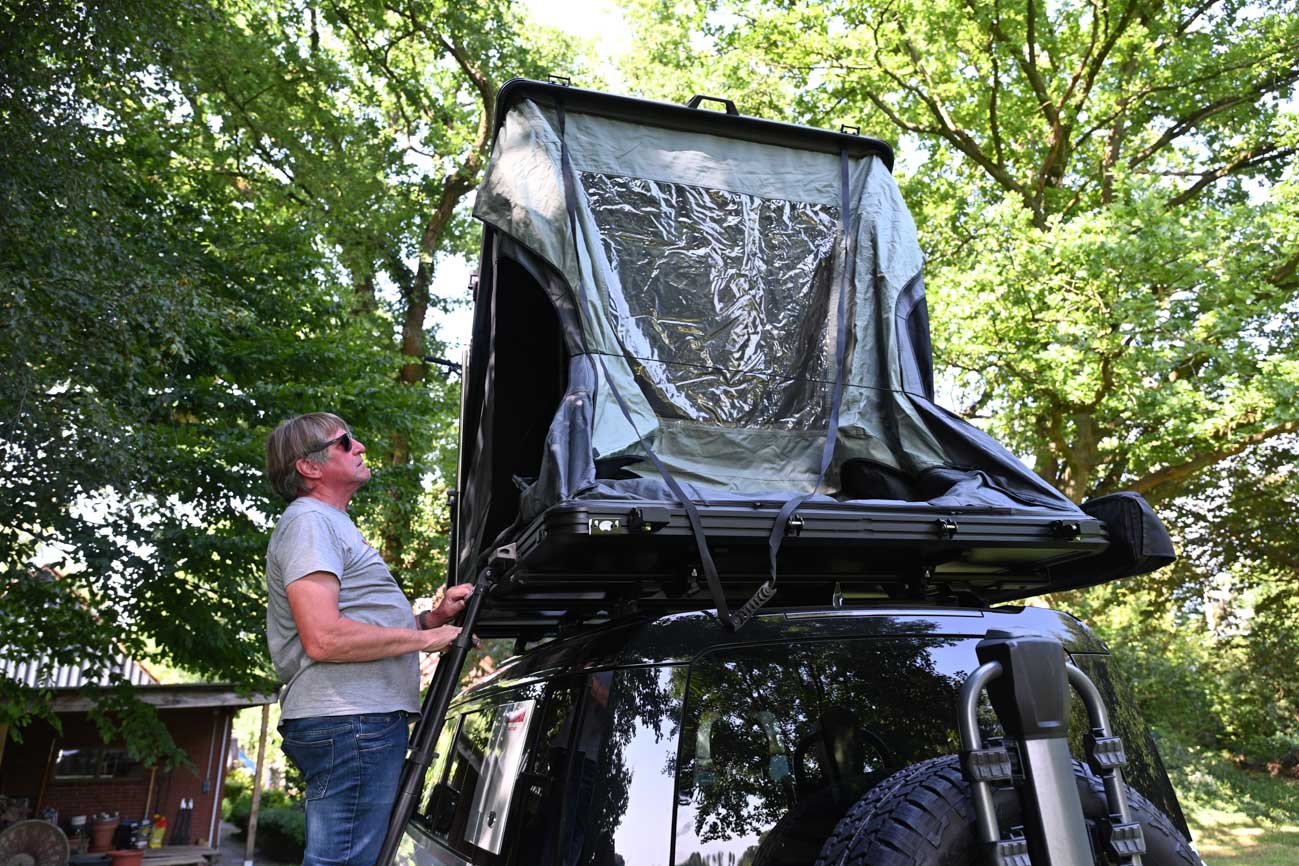 Will man die nicht herunterheben, bevor man das Zelt aufklappt – auch kein Problem. Die beiden Gasdruckfedern stemmen das Dach trotzdem problemlos hoch. Allerdings sollten die Dachträger dann nur noch mit guten 30 Kilo beladen sein. Ein kleiner Schubs reicht und das Dach öffnet selbstständig. Runter geht es übrigens genauso problemlos.