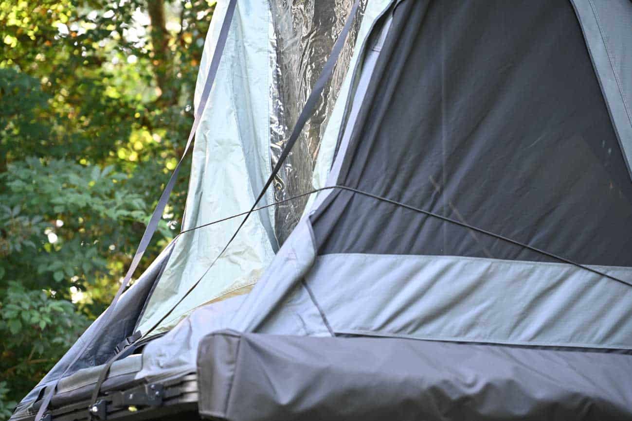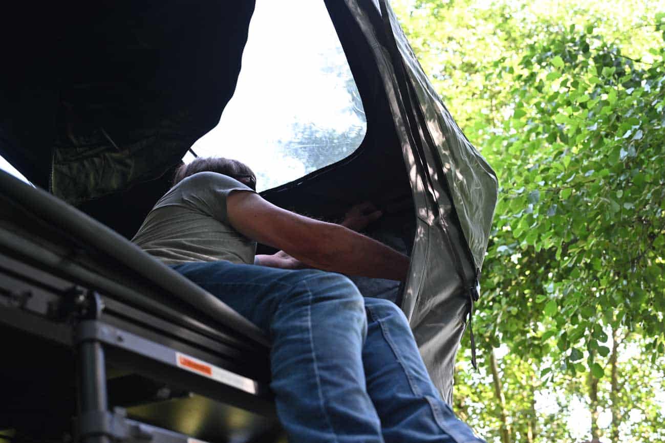 Ins Zelt hinein kommt man entweder von den beiden Seiten oder von hinten. Denn alle drei Seiten lassen sich komplett öffnen. So kann man wählen, wo man die Leiter anstellen will. Die hakt an dafür vorgesehenen Punkten ein und kann nicht versehentlich wegrutschen. Die Zugänge verfügen über eine Patte aus Zeltstoff und ein Moskitonetz.