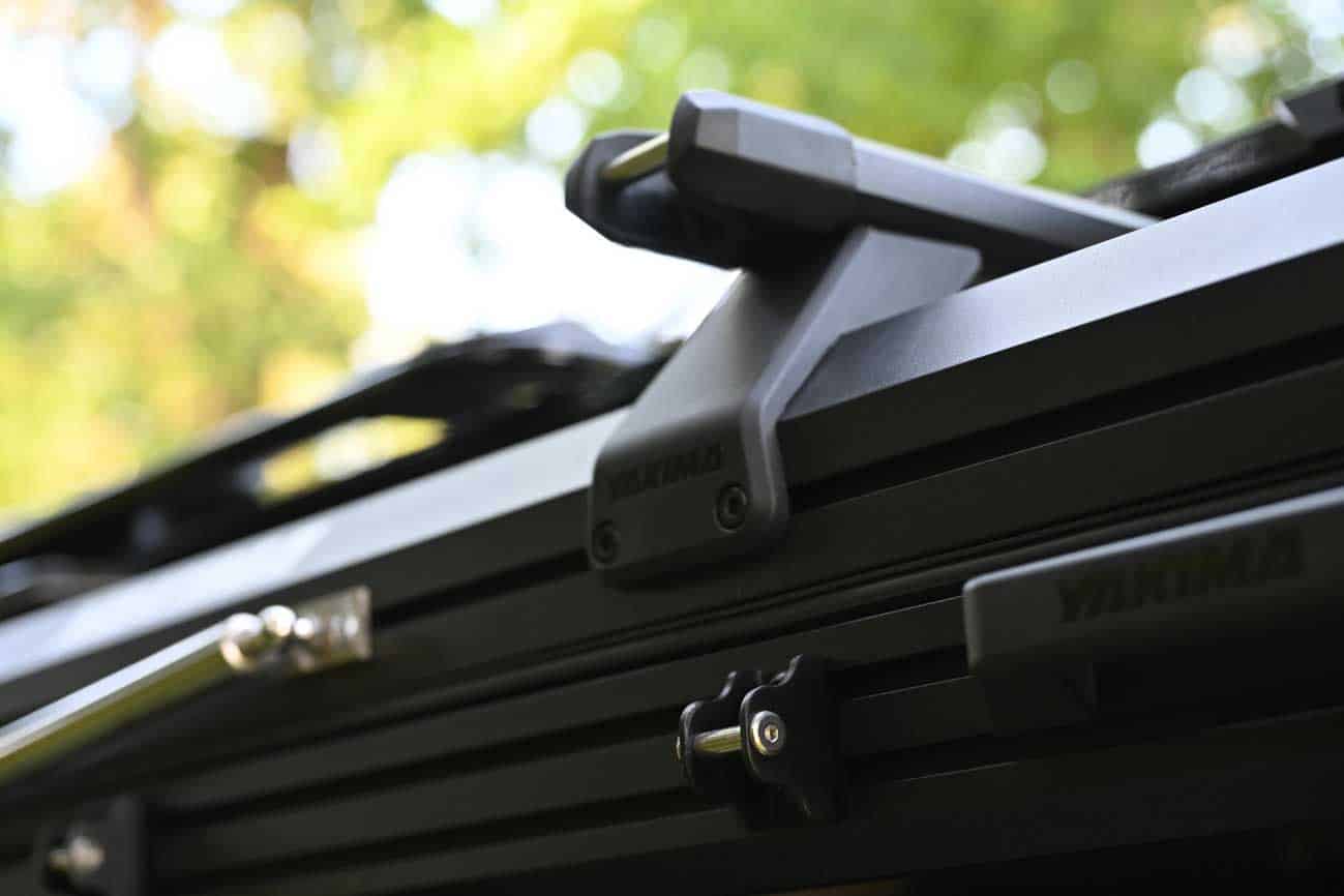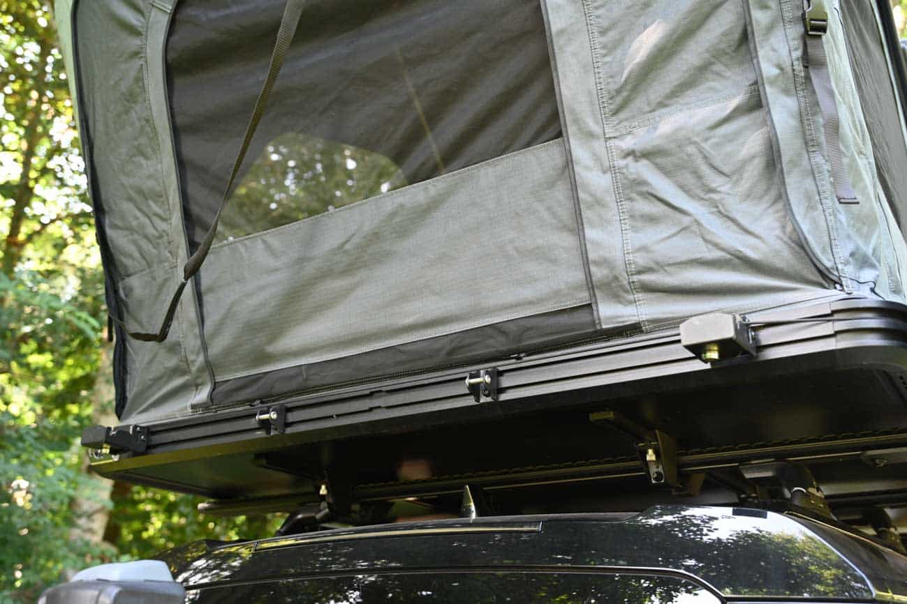 Doch fangen wir noch vor dem Beginn einer Reise oder eines Camping-Urlaubs an. Denn nichts ist nerviger als ewiges Gefummel, bis das Dachzelt endlich auf dem Auto montiert ist. Und das geht beim SkyPeak HD zum Glück relativ einfach und schnell. Dank der anschließbaren Zeltklemmen, mit denen das Dachzelt auf dem Dachträger befestigt wird, gehört umständliches Einstellen der Breite und das Hantieren mit Schraubenschlüsseln der Vergangenheit an. Denn die Klemmen lassen sich problemlos auf die Breite des jeweiligen Dachträgers oder der Dachplattform einstellen. Anpassen, verklemmen, abschließen – fertig.