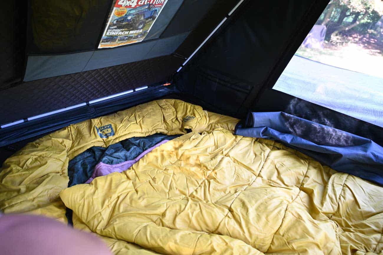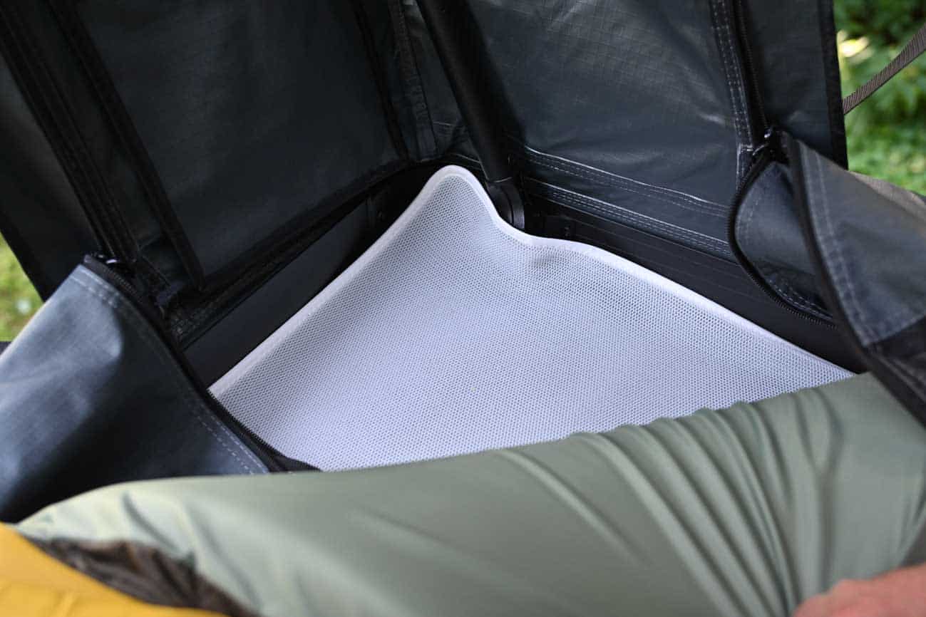 Die Moskitonetze sind im unteren Bereich jedoch mit Zeltstoff versehen, was einen Sichtschutz von unten bieten soll. Eine gute Idee, denn so kann man selbst raus, aber andere nicht hinein sehen. Die Liegefläche beträgt 140 x 207 Zentimeter. Viel Platz also für zwei Erwachsene. Ist man allein unterwegs, kann man sich so richtig breit machen. Die Memory-Foam-Matratze ist sechs Zentimeter dick und wirklich bequem. Zur Unterlüftung liegt noch eine Antikondensationsmatte darunter.