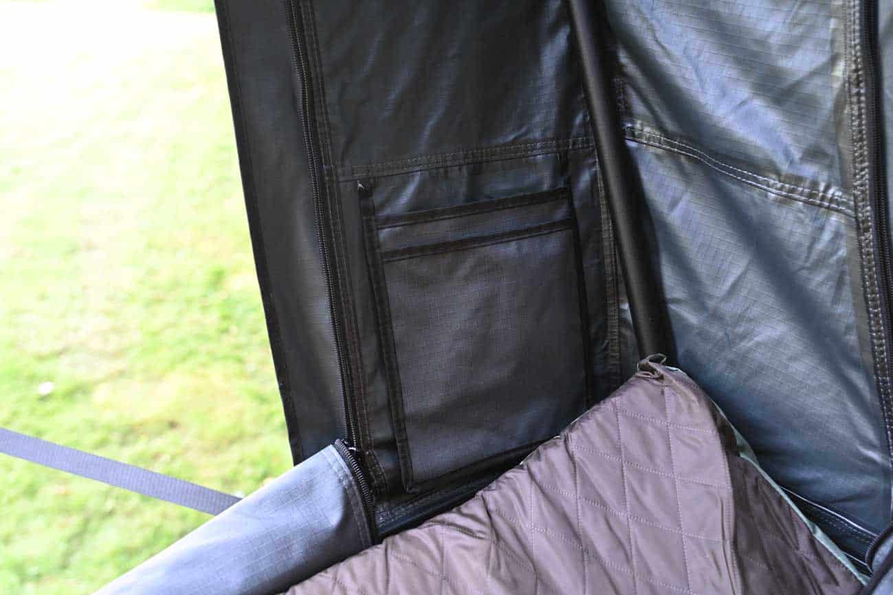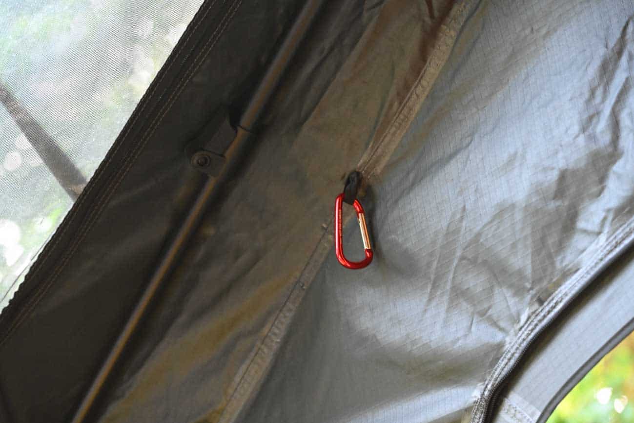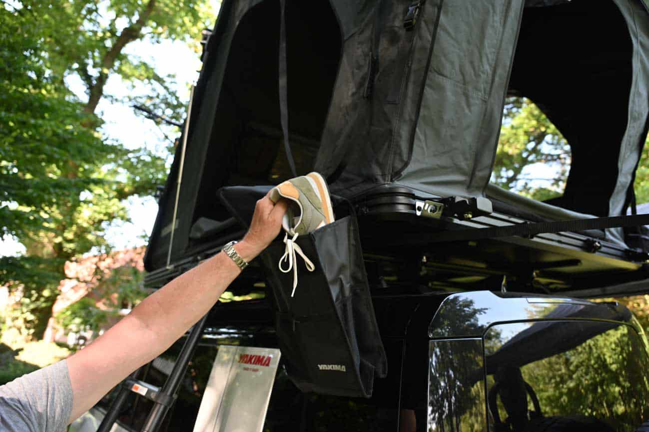 Damit die – eventuell schmutzigen – Schuhe nicht mit ins Dachzelt müssen, sind zwei Schuhtaschen ebenfalls im Lieferumfang enthalten. Sie werden an passenden Haken an beliebiger Stelle in der im Rahmen umlaufenden C-Schiene befestigt. Die Schiene, an der auch andere Dinge befestigt werden können, ist mit 34 Kilo belastbar.