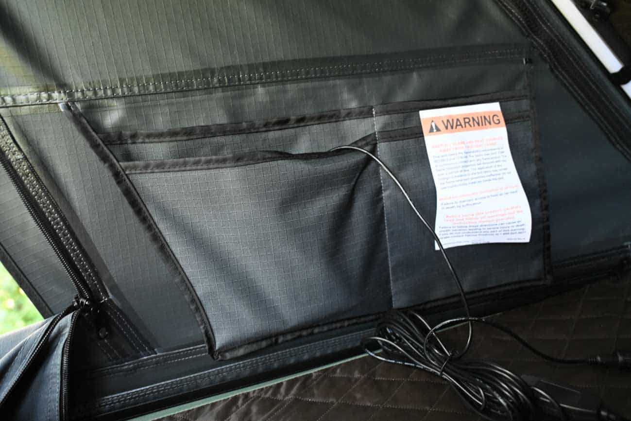 Innen an den Zeltwänden sind mehrere kleinere und größere Taschen angebracht. Egal also, ob Zeitschriften, Bücher, Handy, Tablet, Taschenlampe oder andere Dinge, sie können ordentlich und griffbereit verstaut werden. Auf die Taschenlampe kann man übrigens getrost verzichten, sofern man sie nicht draußen braucht. Denn das SkyPeak HD kommt mit LED-Beleuchtung. Die ist dimmbar und man kann die Farbe zwischen Weiß und warmem Gelb wechseln. Damit es hell wird, benötigt man allerdings noch eine Powerstation oder führt das Kabel über eine Reißverschluss-Öffnung nach draußen und ins Fahrzeug. Durch diese Öffnung lässt sich in kalten Nächten auch ein Luftschlauch einer Heizung legen.