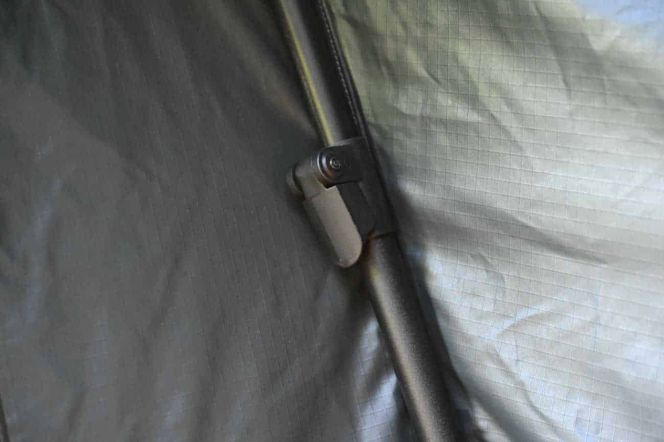 Um den Zeltstoff ist ein Gummiband gespannt, das dafür sorgt, dass sich der Stoff beim Zusammenklappen nach innen zieht. Nach dem Aufstellen wird es einfach nach unten gezogen und unter den Klappenverschlüssen platziert. Damit ist es aus dem Weg und stört nicht. Jetzt noch den Bügel nach hinten klappen und mit einem Klick verriegeln. Das Zelt steht. Hat man das ein paarmal gemacht, dauert das keine zwei Minuten. Schlafsack oder Bettzeug können übrigens ebenfalls beim Transport im Zelt bleiben.